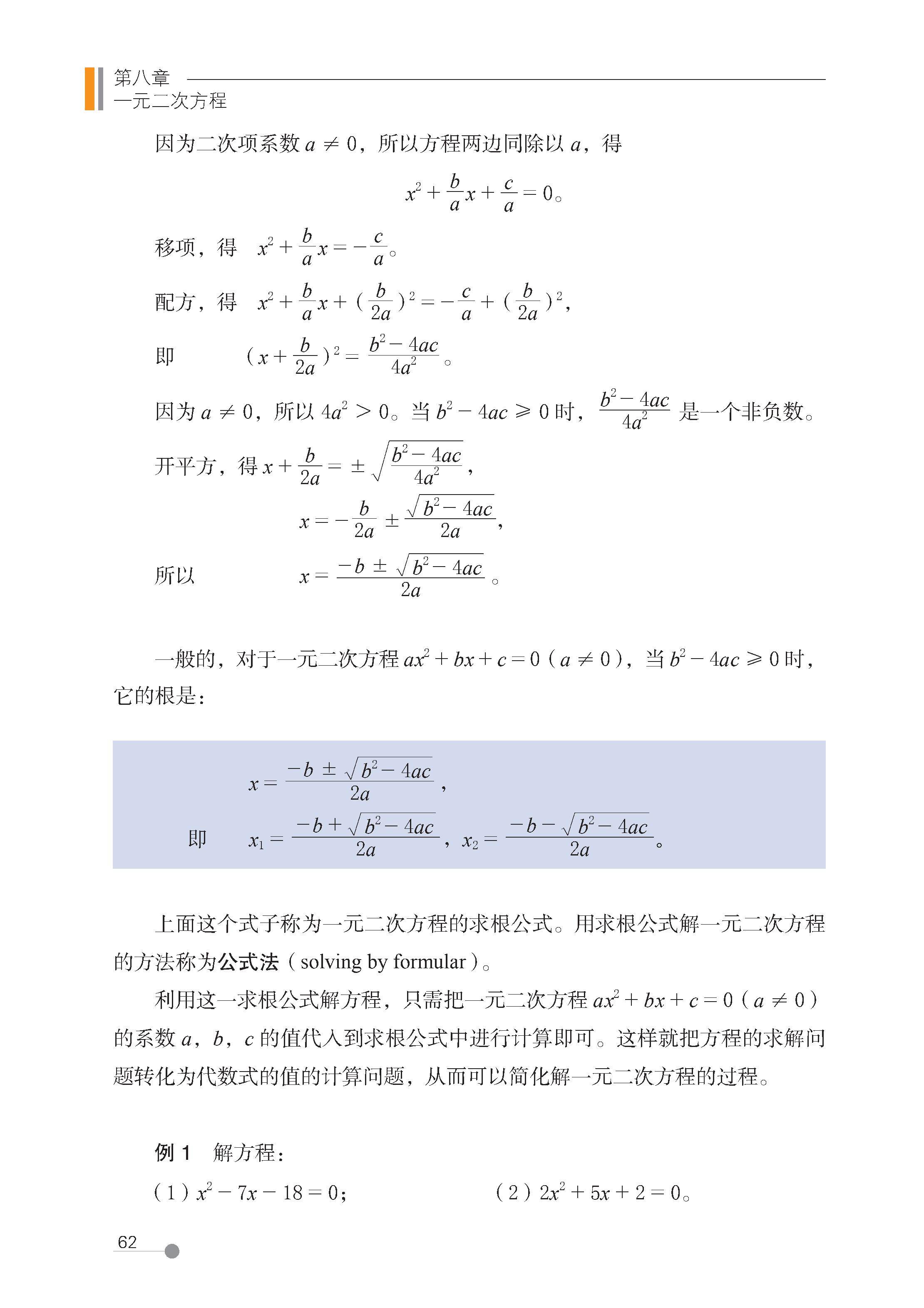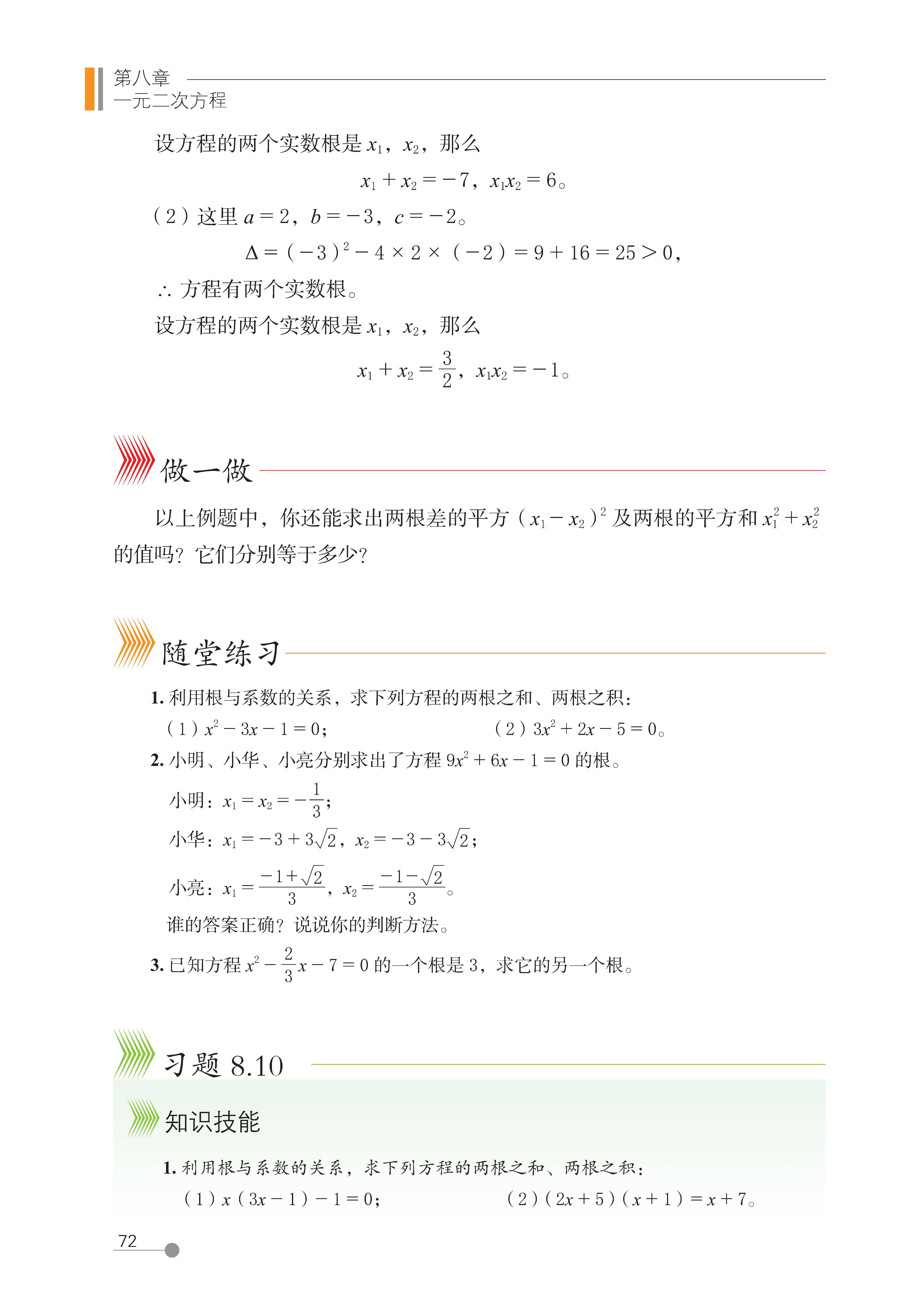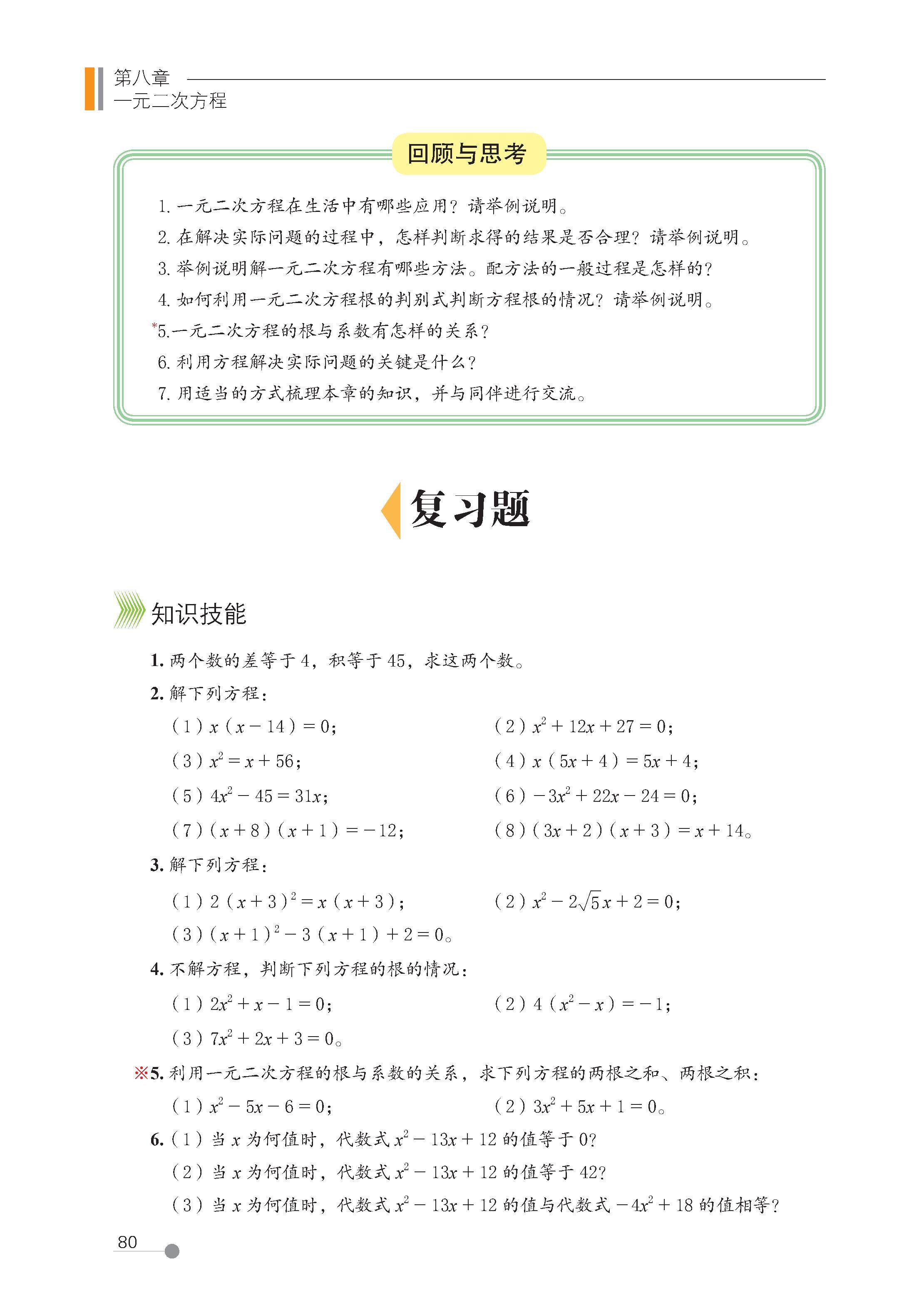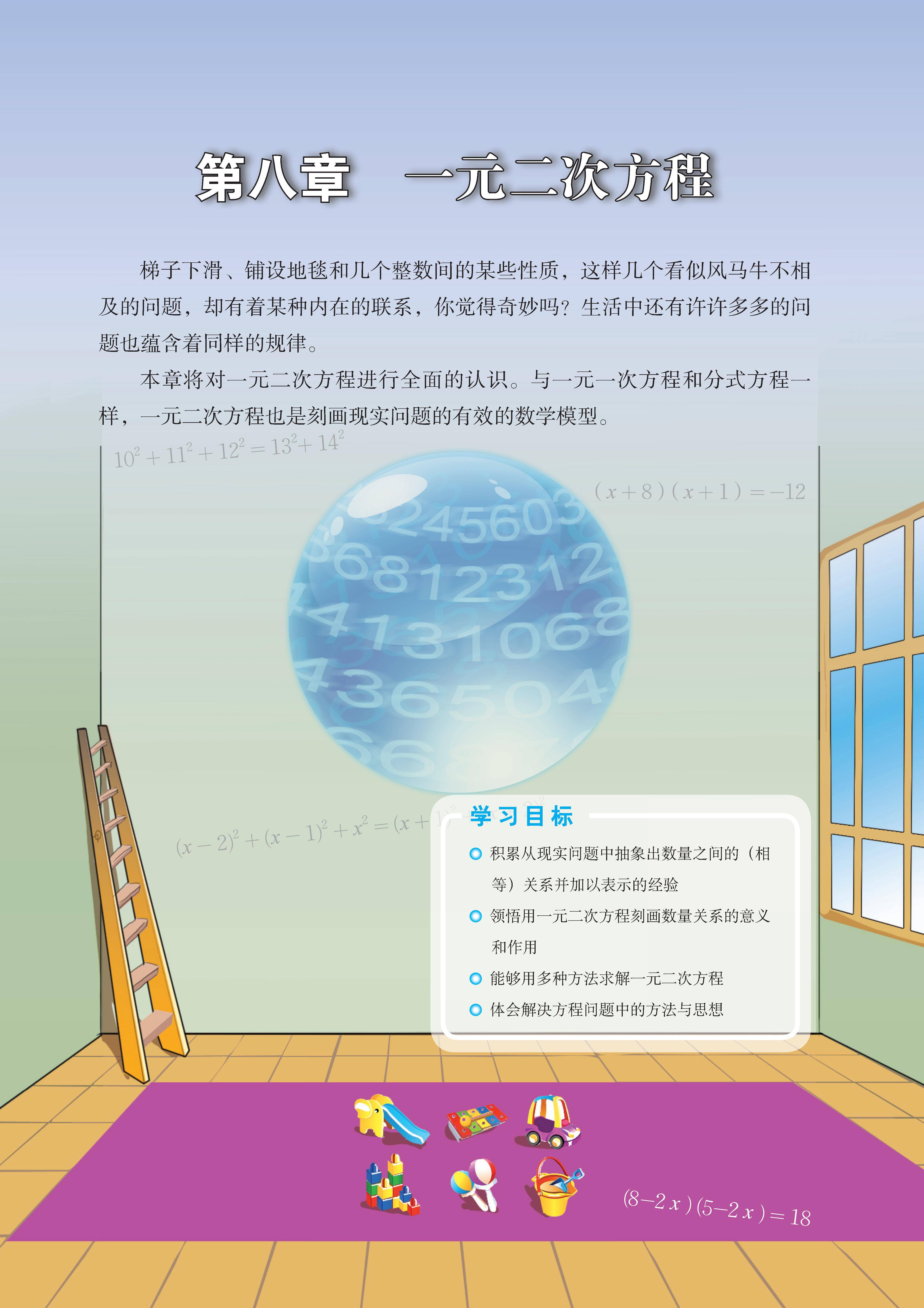 第八章 “一元二次方程”:解法有固定流程(如配方法:移项→化二次项系数为 1→配方→开方→求解),根与系数的关系(韦达定理)虽需理解,但应用题型多为 “已知根求系数”“已知系数求根的关系”,套路性强,练习后易掌握。