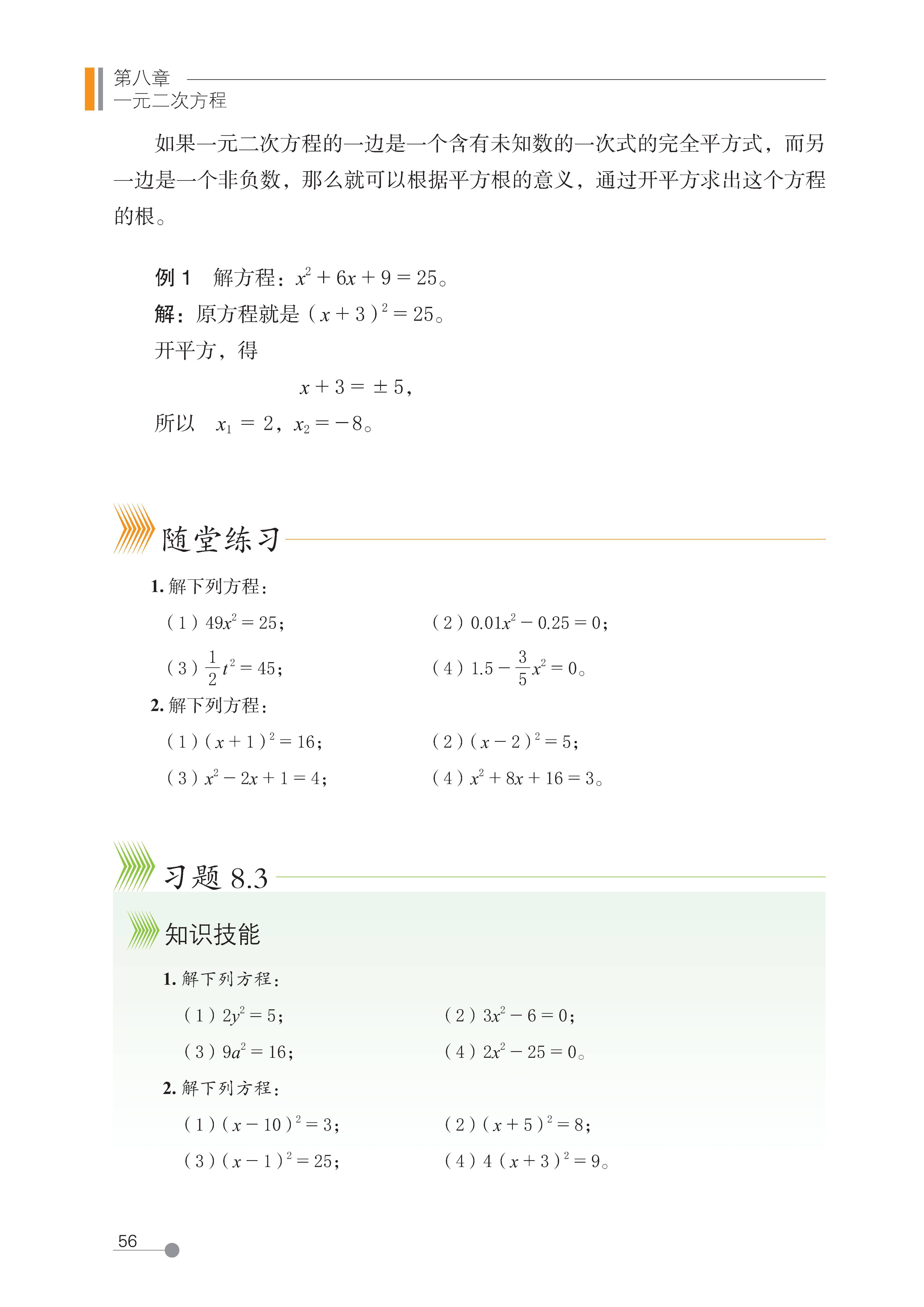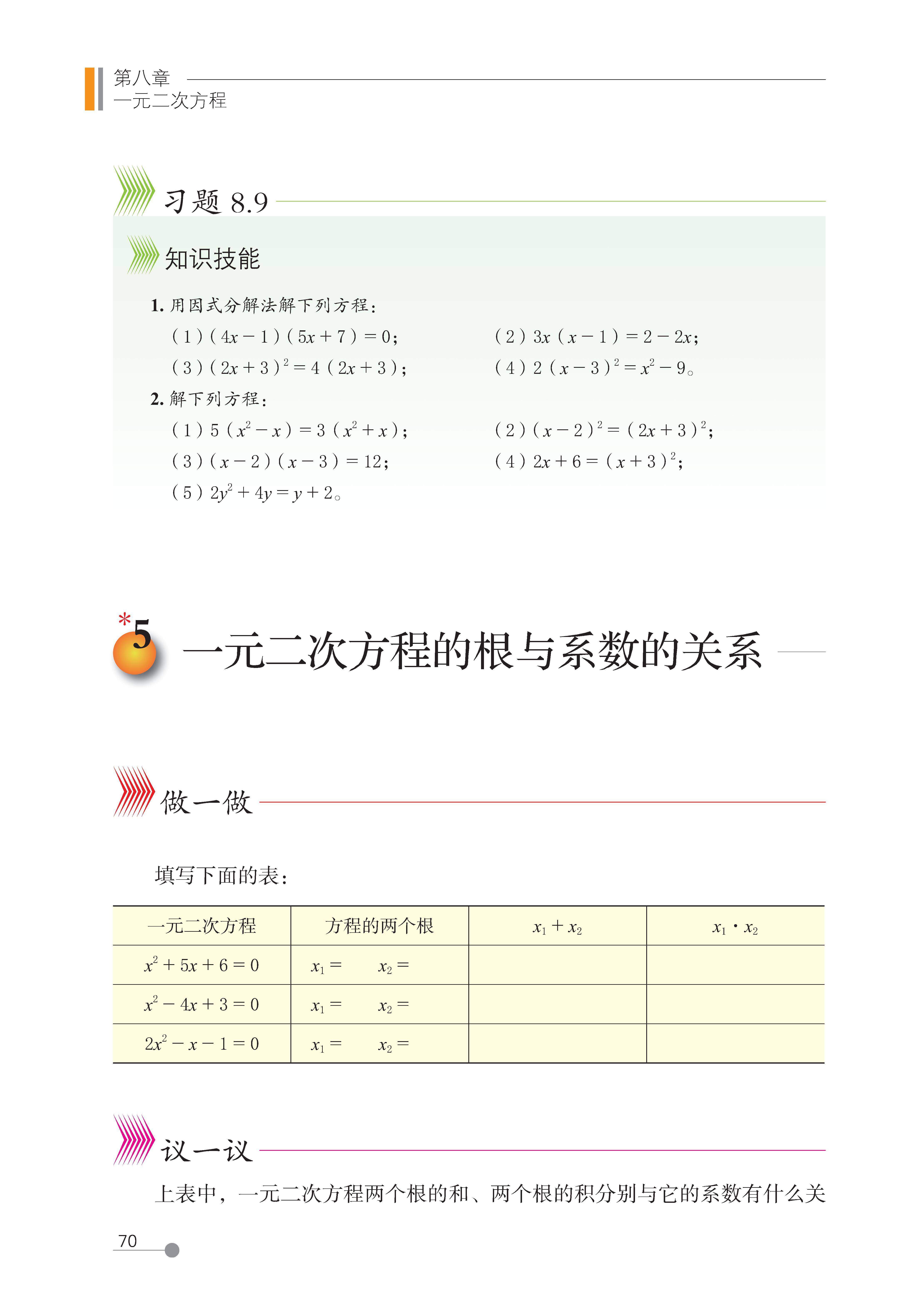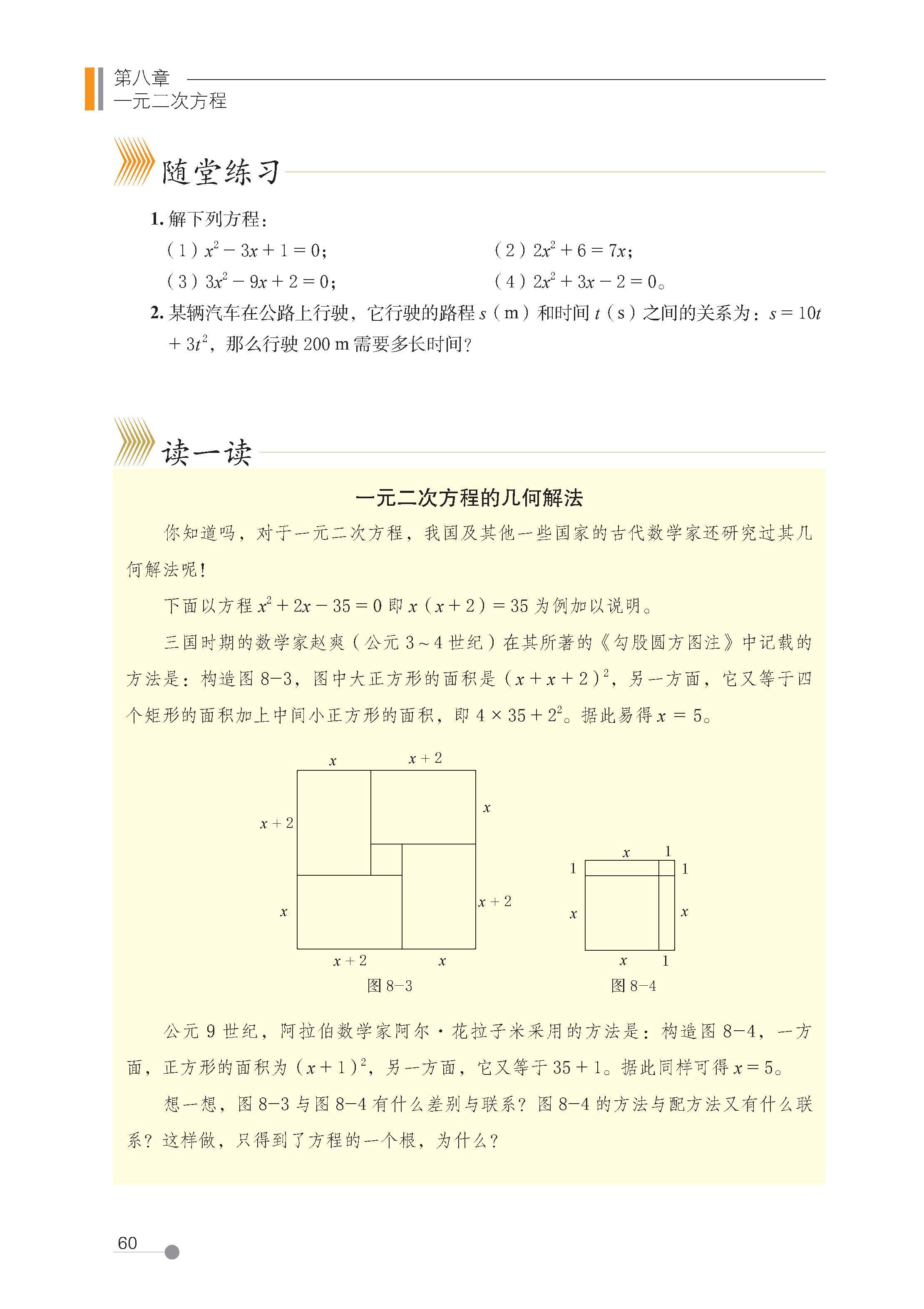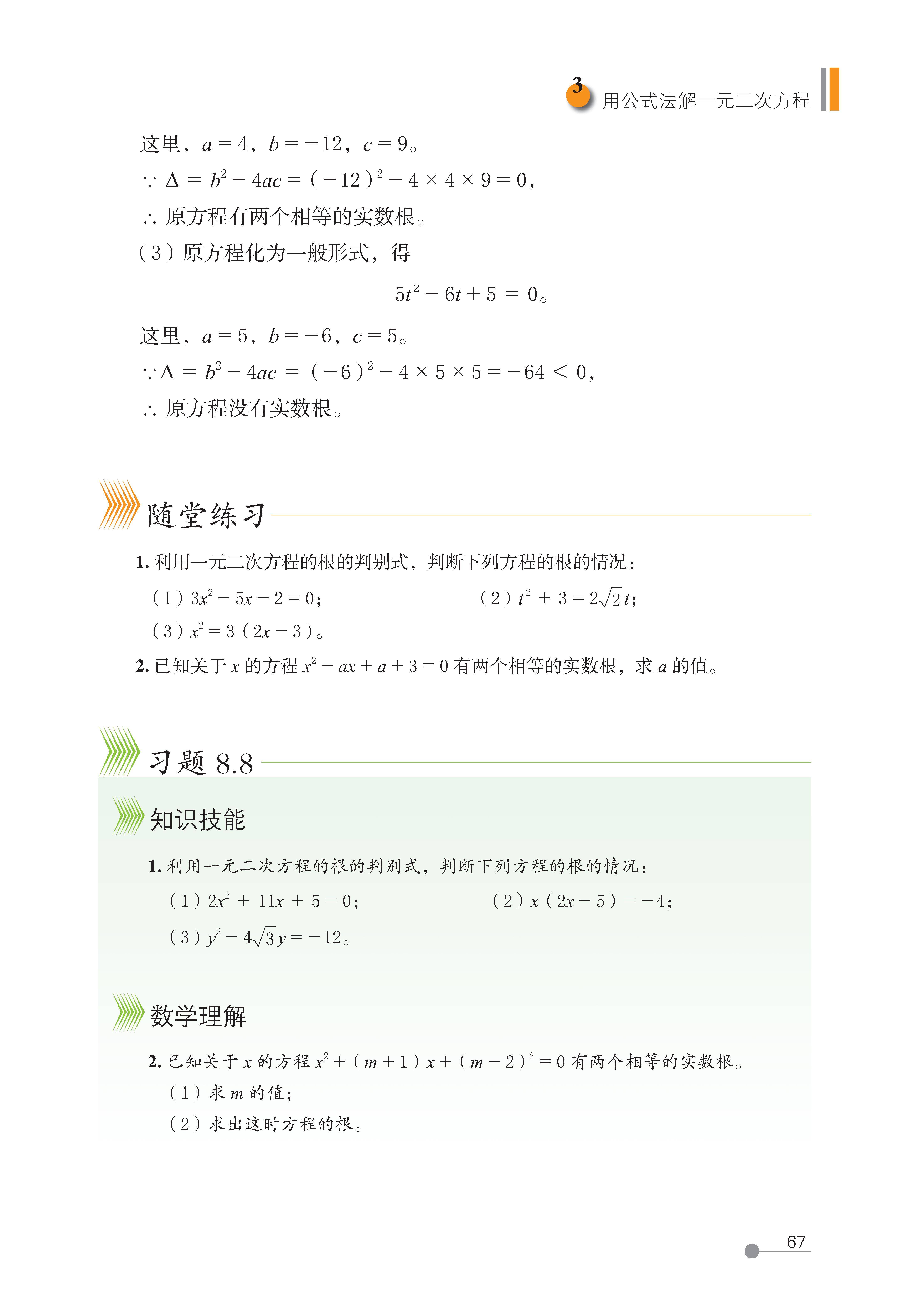 第八章 “一元二次方程”:解法有固定流程(如配方法:移项→化二次项系数为 1→配方→开方→求解),根与系数的关系(韦达定理)虽需理解,但应用题型多为 “已知根求系数”“已知系数求根的关系”,套路性强,练习后易掌握。