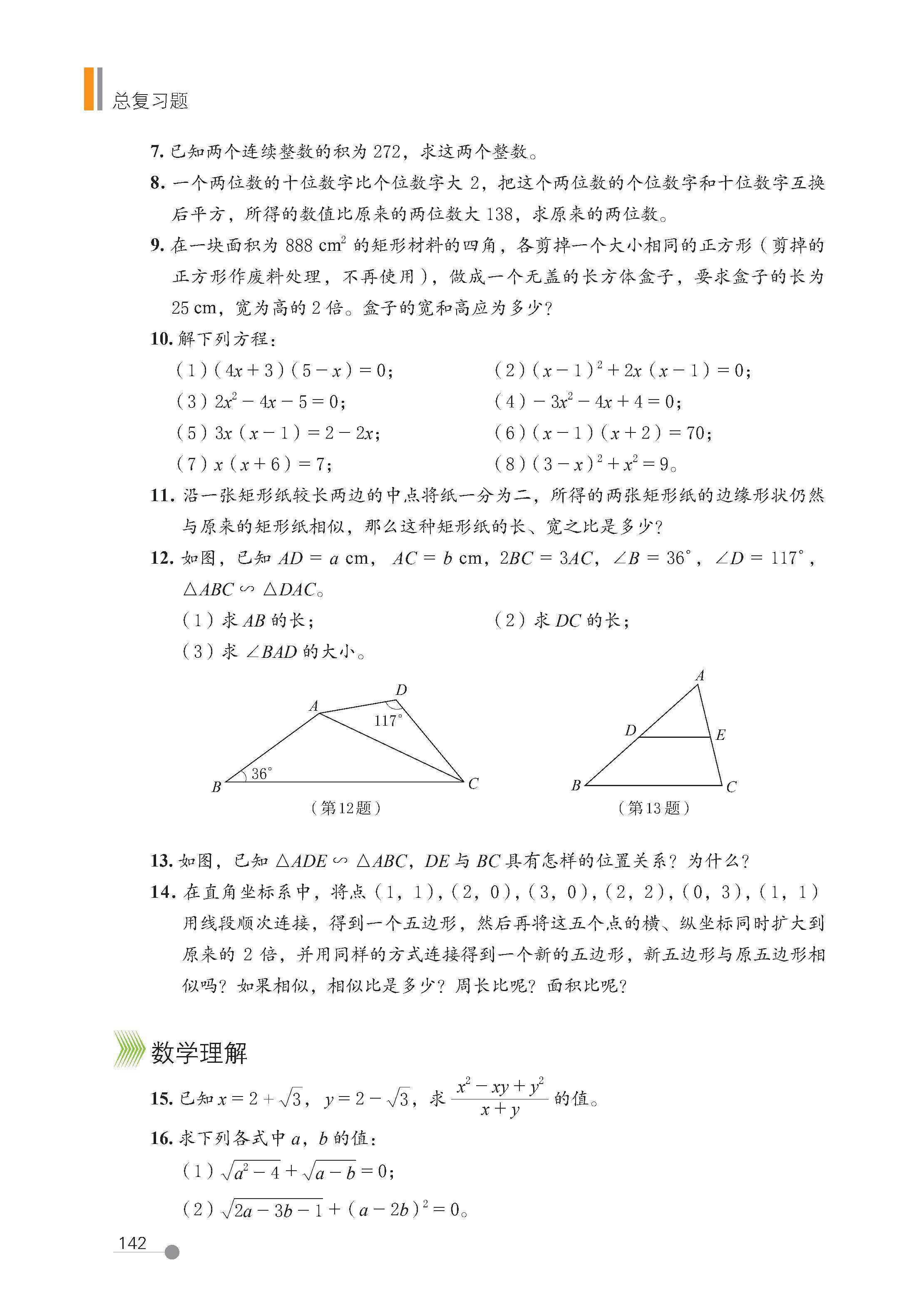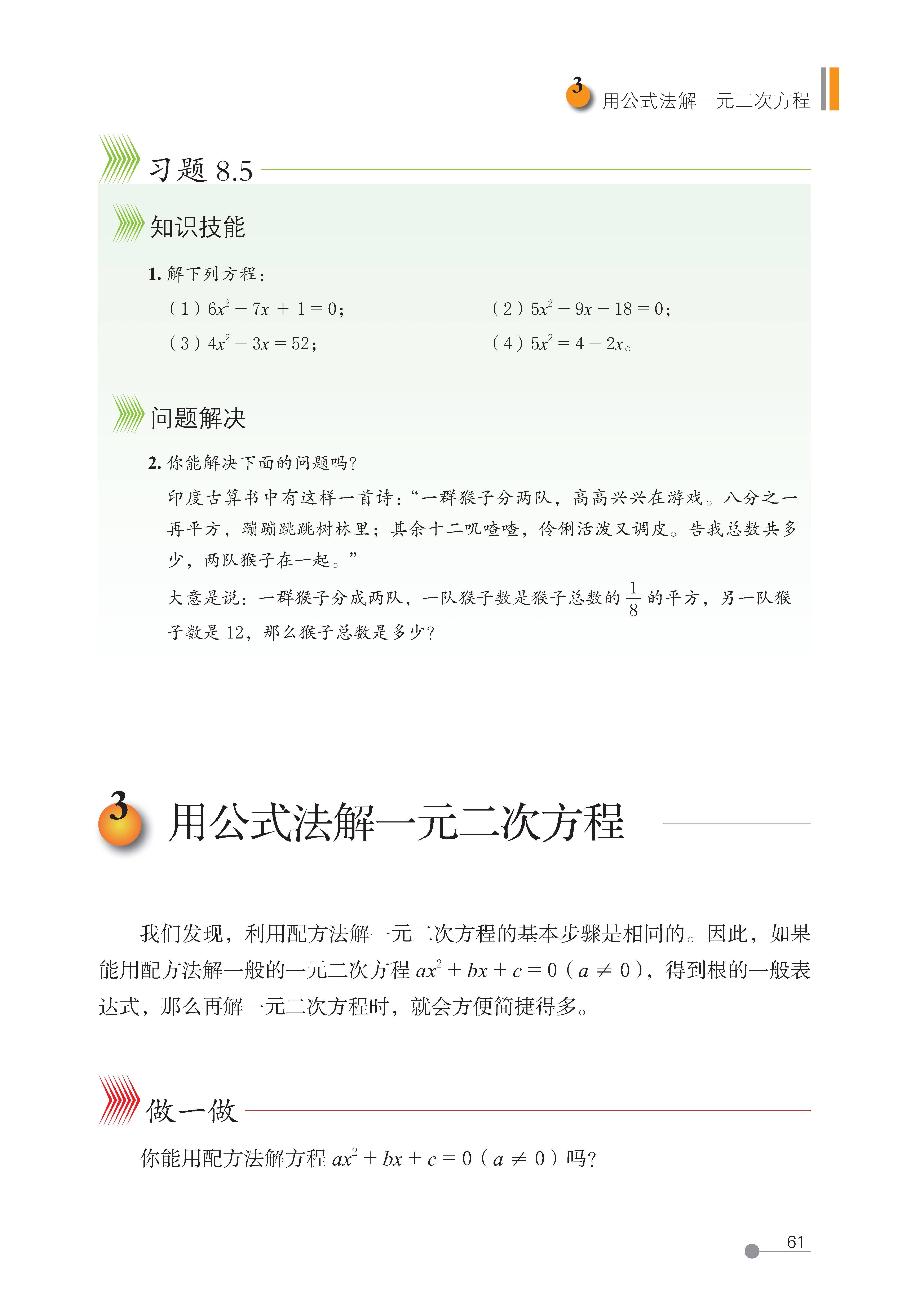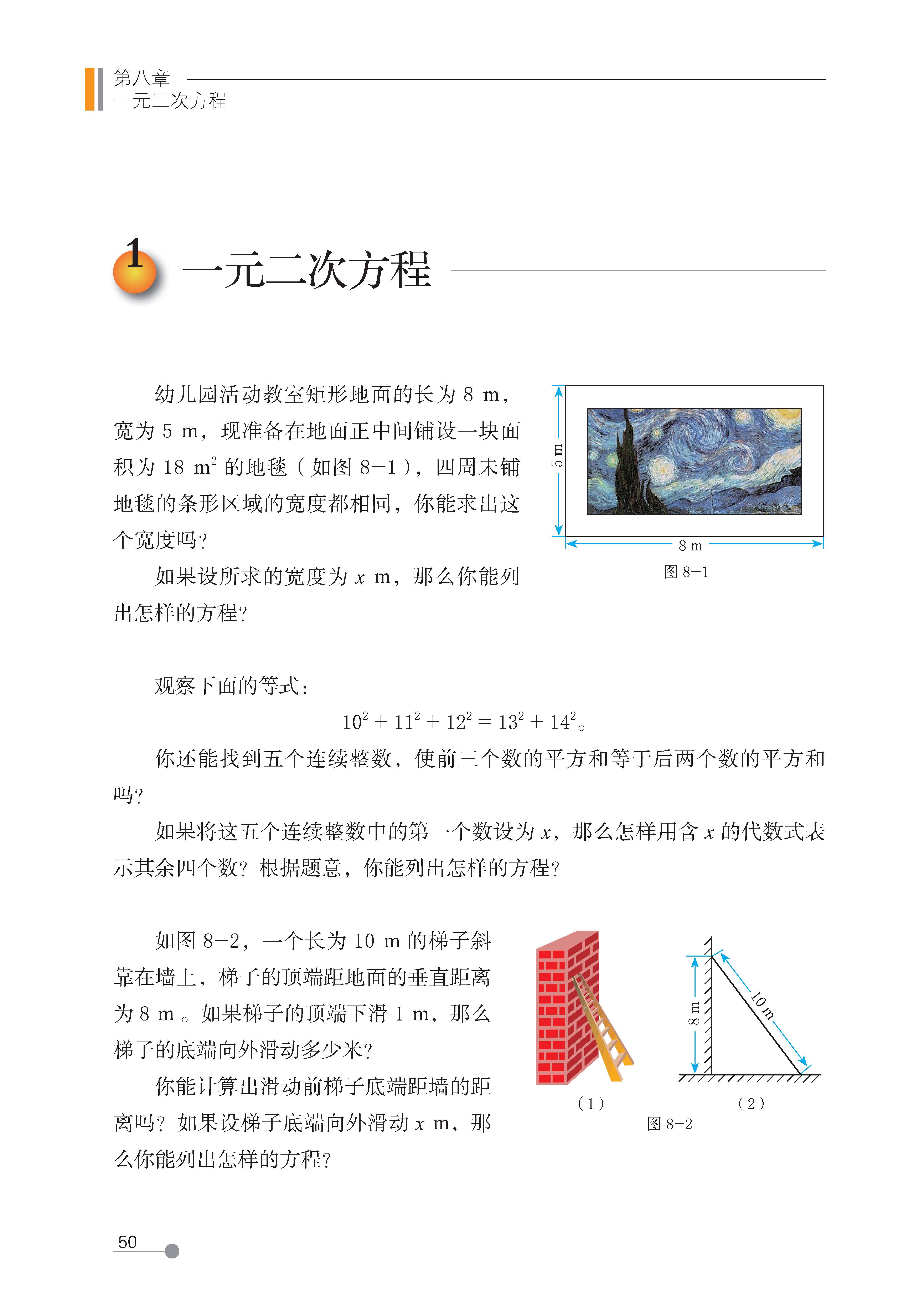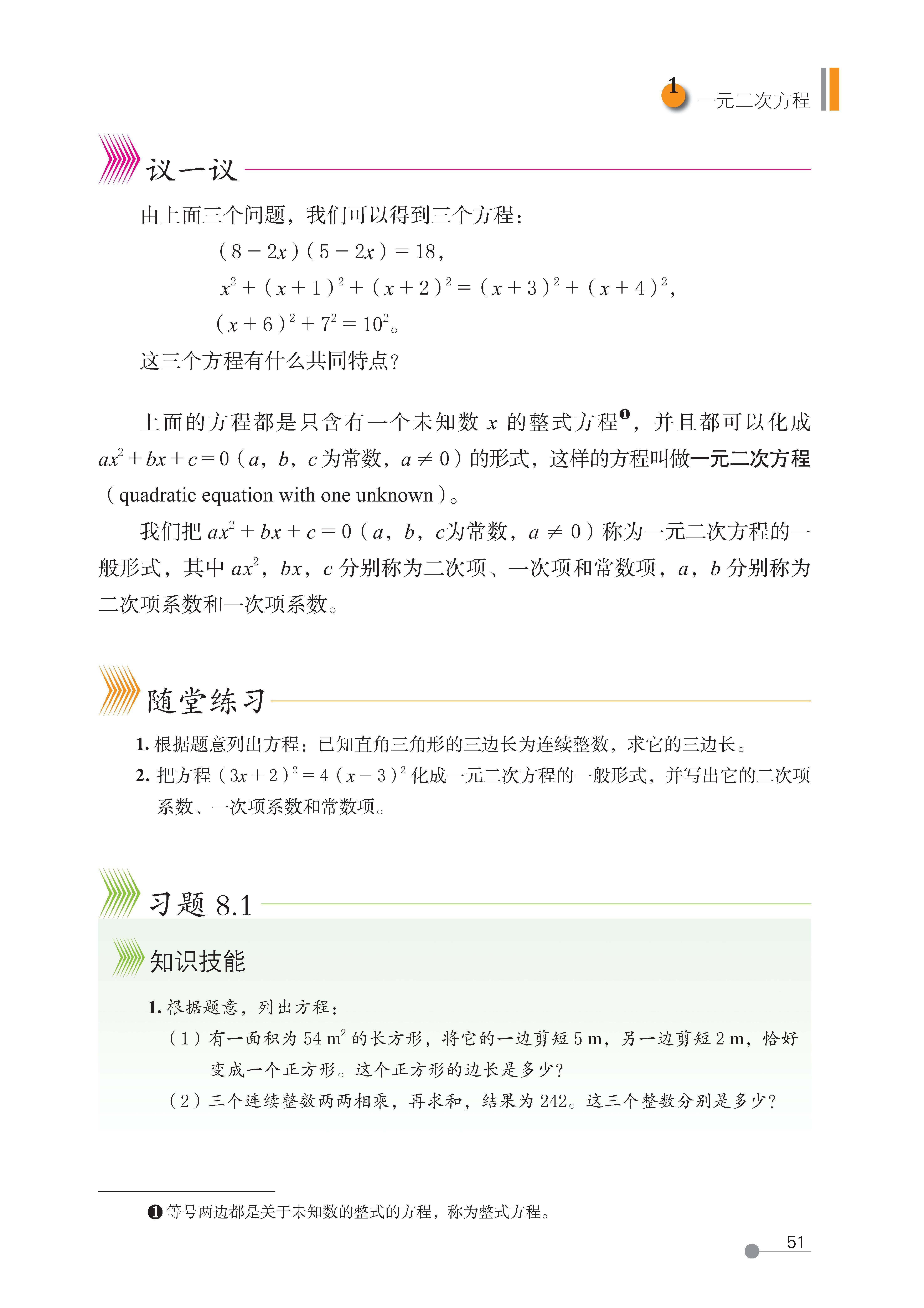 第八章 “一元二次方程”:解法有固定流程(如配方法:移项→化二次项系数为 1→配方→开方→求解),根与系数的关系(韦达定理)虽需理解,但应用题型多为 “已知根求系数”“已知系数求根的关系”,套路性强,练习后易掌握。