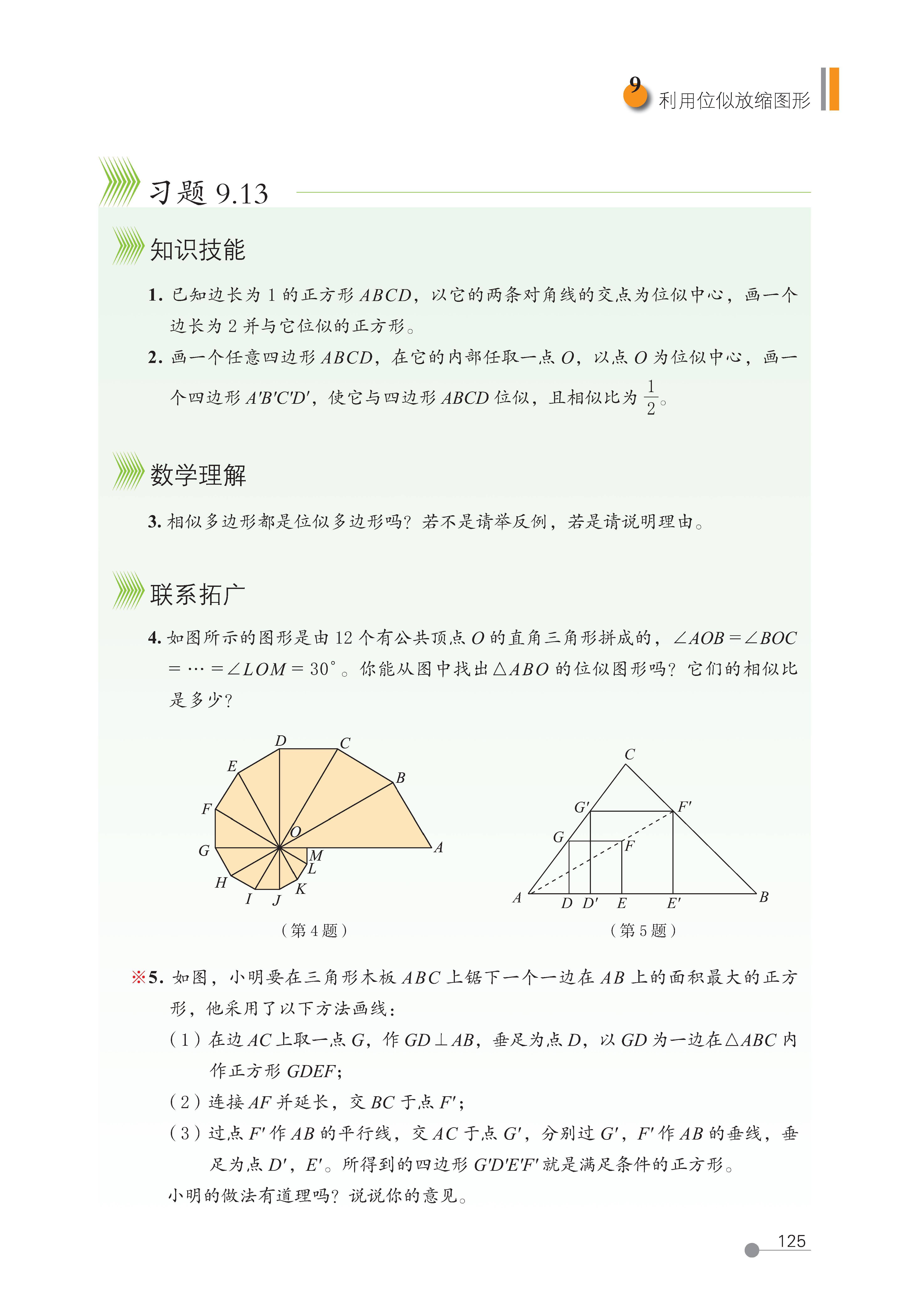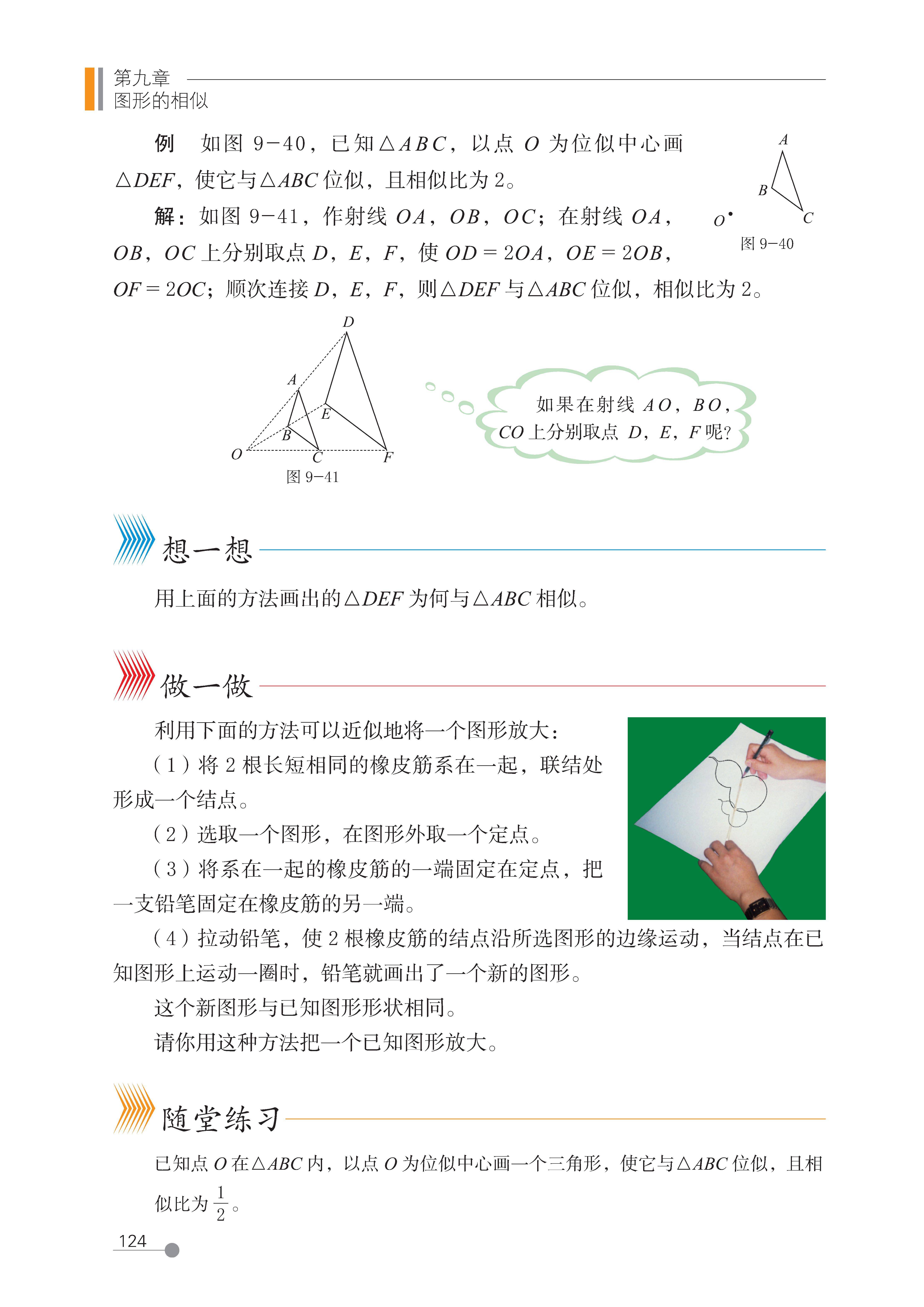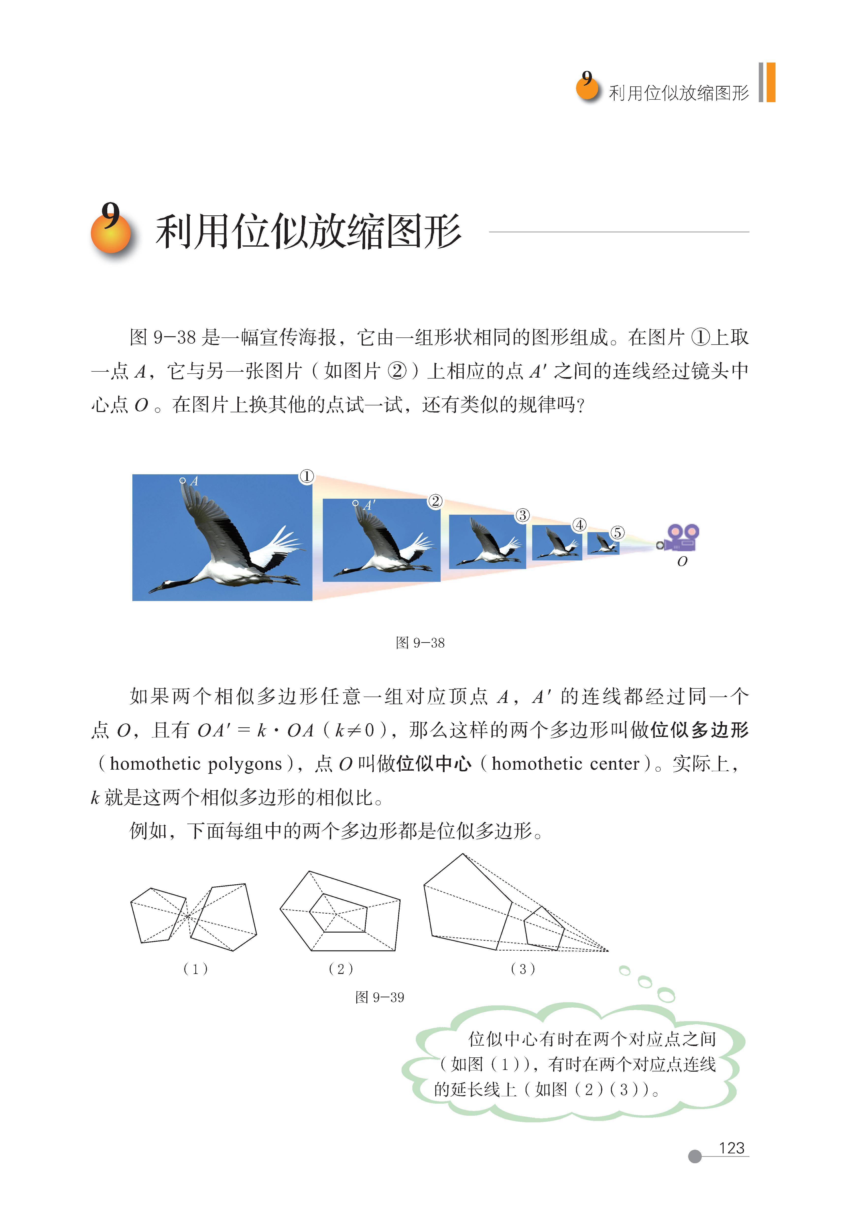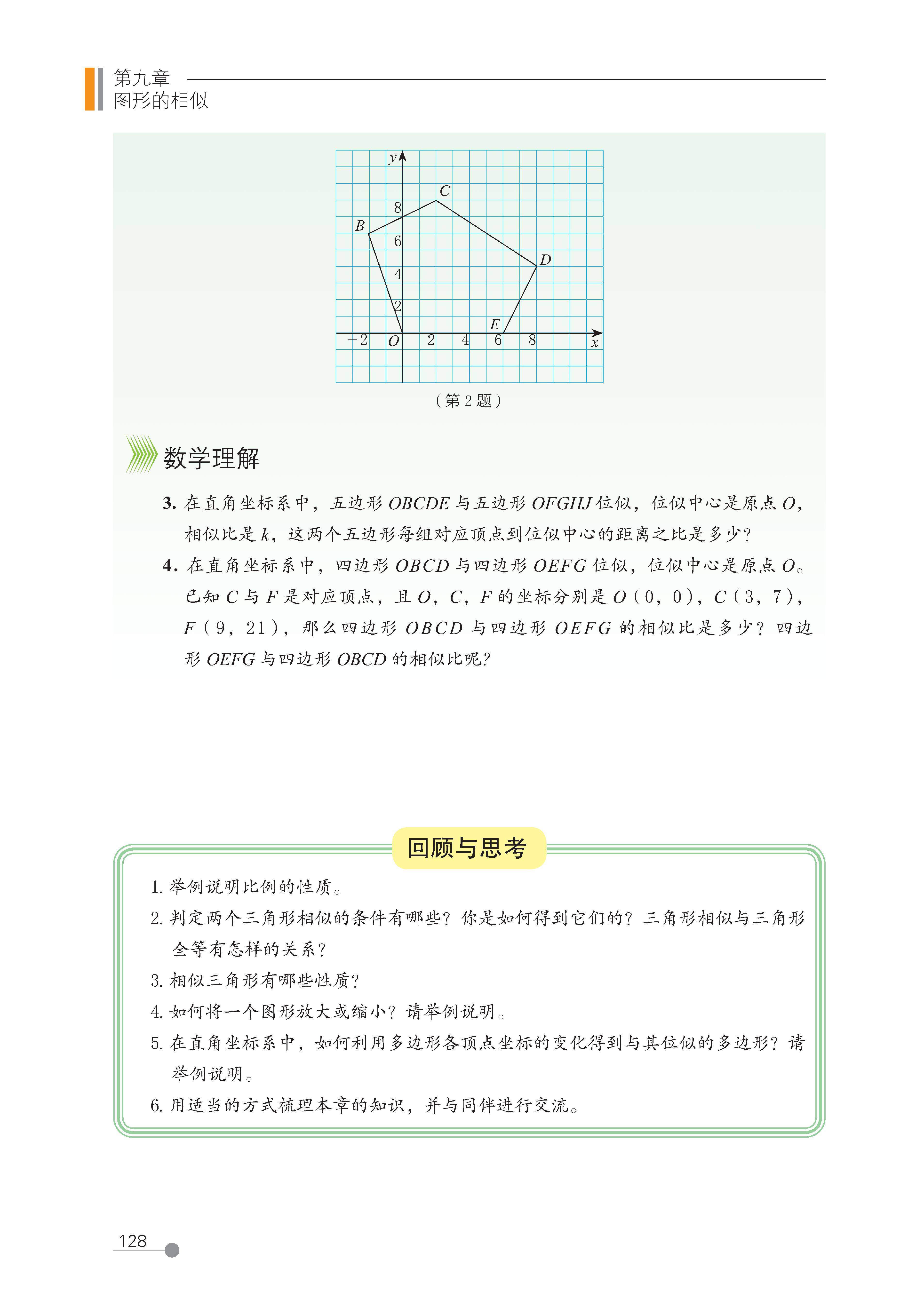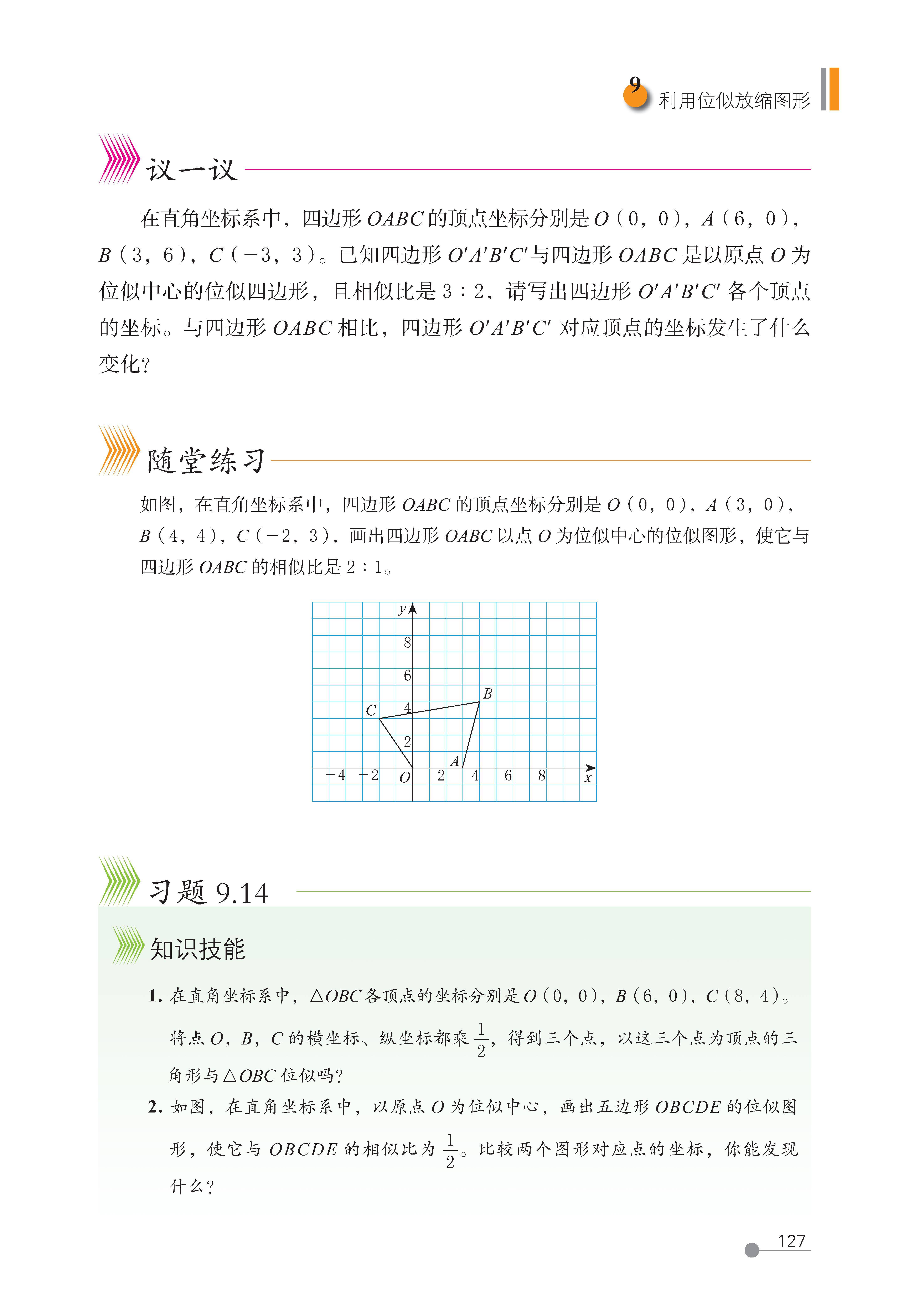 位似图形的坐标变化(如以原点为位似中心,相似比为 k,则点 (x,y) 变为 (kx,ky) 或 (-kx,-ky))。
