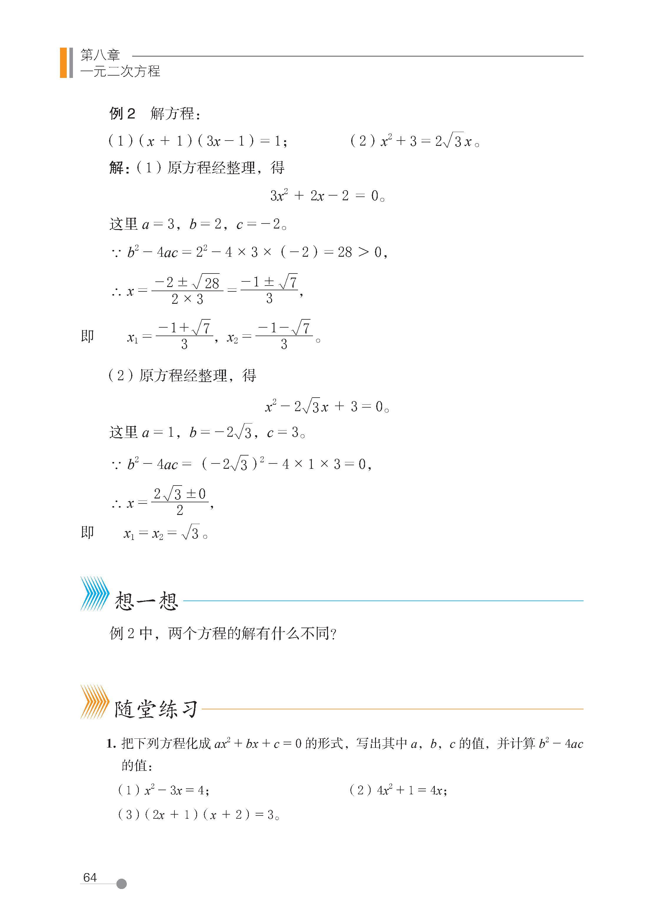 第八章 一元二次方程 解法(配方法、公式法、因式分解法)、根与系数的关系、应用 1. 配方法的步骤(二次项系数不为 1 时的变形);