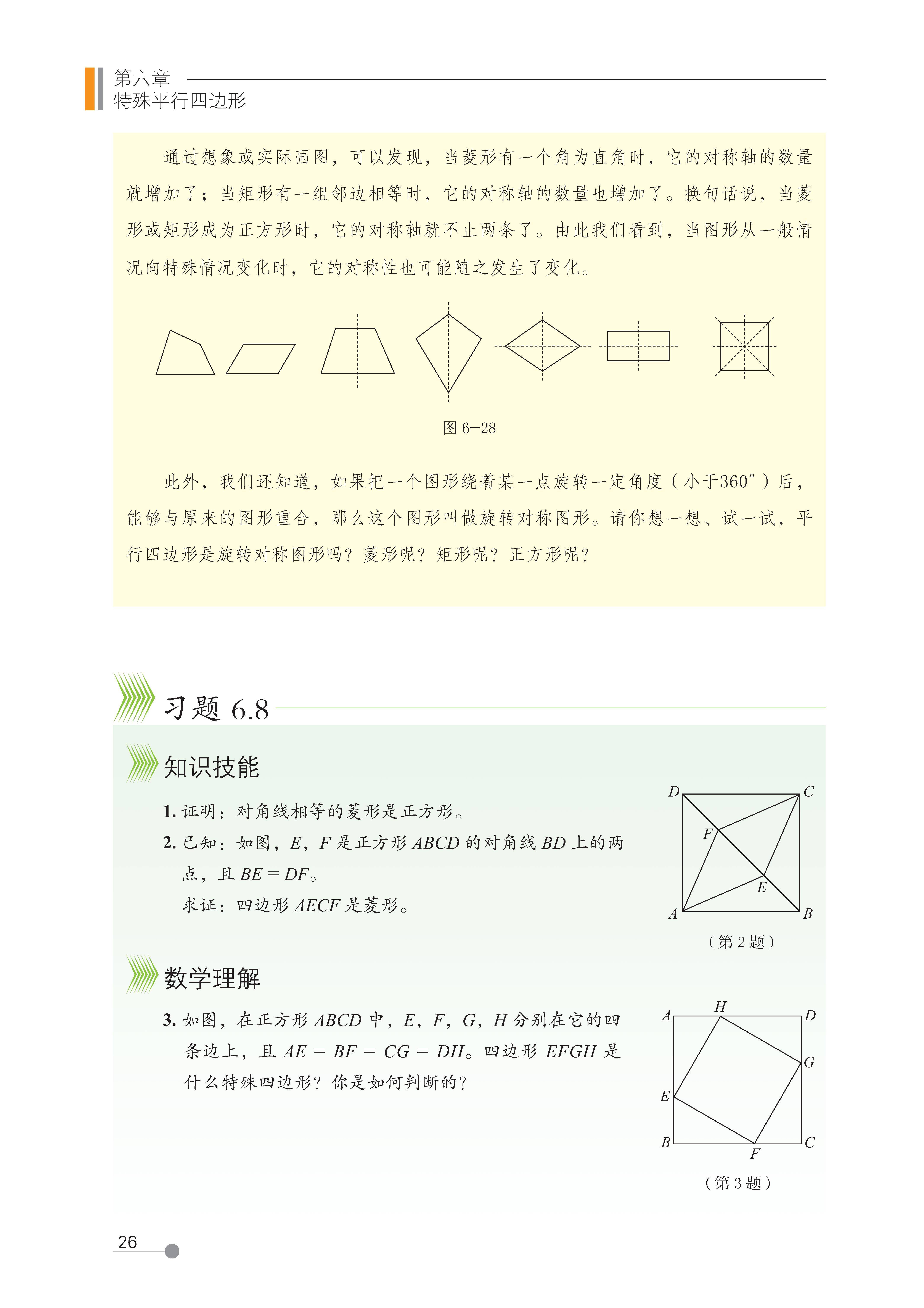 第六章 特殊平行四边形 菱形、矩形、正方形的性质与判定 1. 区分三种特殊图形的 “特殊条件”(如菱形需 “邻边相等”,矩形需 “直角”);
