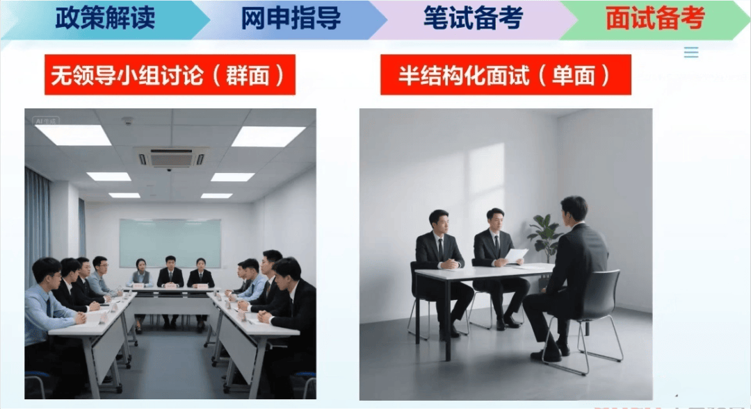 对于银行的面试,一般分为线上一轮面试和线下二轮面试两个环节。线上一轮面试主要以AI面试为主,线下二轮面试主要以半结构化(单面)和无领导小组(群面)的形式开展。