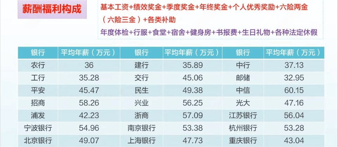 在薪资待遇方面,12家股份制银行的待遇排名靠前,其中一些银行年薪最高可达60W左右,国有6大行的待遇紧随其后,总行的待遇以国家公务员标准为主。此外,银行系统都可以为员工提供六险二金或六险三金的保障以及各类补贴,福利待遇较为完善。