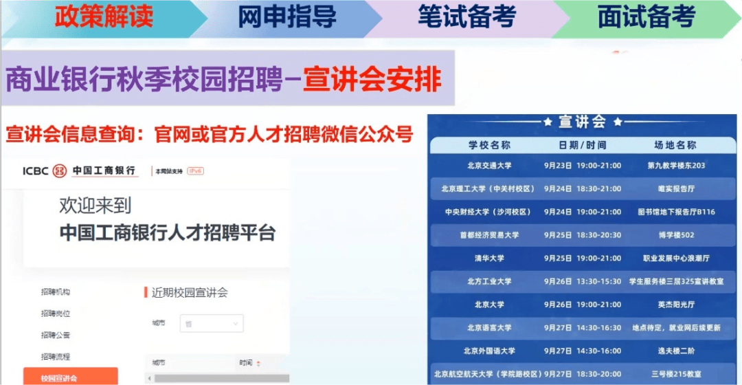 对于银行每年的招聘公告,都可以从线上和线下两个渠道进行获取。对于线上渠道,可通过查询目标银行的官方网站或官方人才招聘微信公众号明确报名时间,报名方式和报名条件;对于线下渠道,银行每年招聘季都会前往部分院校开展线下的集中宣讲会,告知同学报名时间、报名方式和报名条件以及后续的流程安排,同样可以通过目标银行的官方网站或官方人才招聘微信公众号查看宣讲会的具体时间地点。