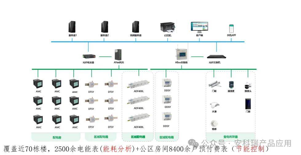 覆盖近70栋楼,2500余电能表(能耗分析)+公区房间8400余户预付费表(节能控制)