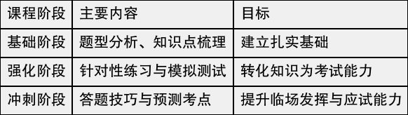 育教大师的课程设计注重基础和应用相结合,提供涵盖考试大纲的全面复习。不同阶段的学习计划,让学生能稳步提升,从知识构建到模拟测试,每一环节都有专门指导。同时,教学团队均为具有丰富经验的老师,他们能根据学生特点,给予个性化辅导。下面是育教大师课程安排的简要概述: