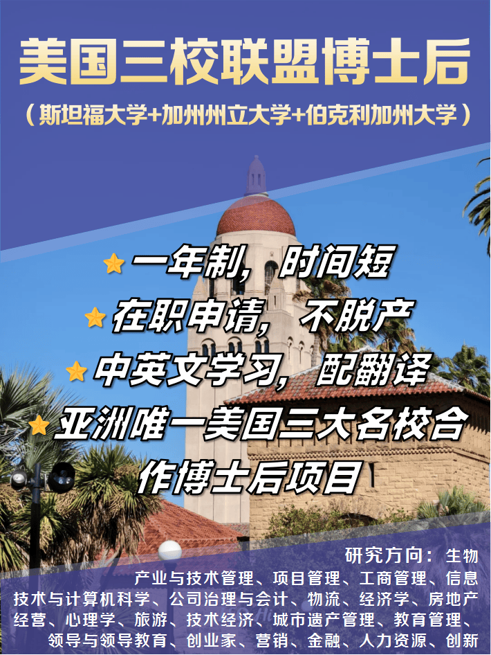 按规定要求上完课程,校方主办单位发给学员下列4张证书:斯坦福大学博士后学习证书1张,伯克利加州大学博士后学习证书1张,学员将获得美国加州州立大学蒙特利湾分校博士后学习证书1张;学生在一年内需撰写一篇文章交于校方审核、发表后,即由美国加州州立大学蒙特利湾分校授予博士后研究员证书1张。