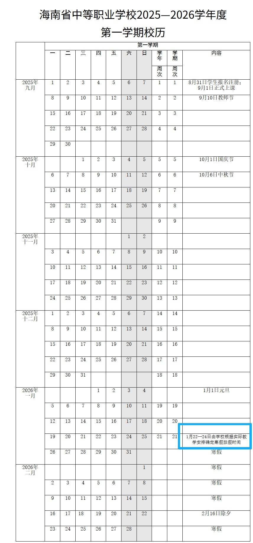 寒假开始时间:2026年1月22日-24日(由学校根据实际教学安排确定寒假放假时间)