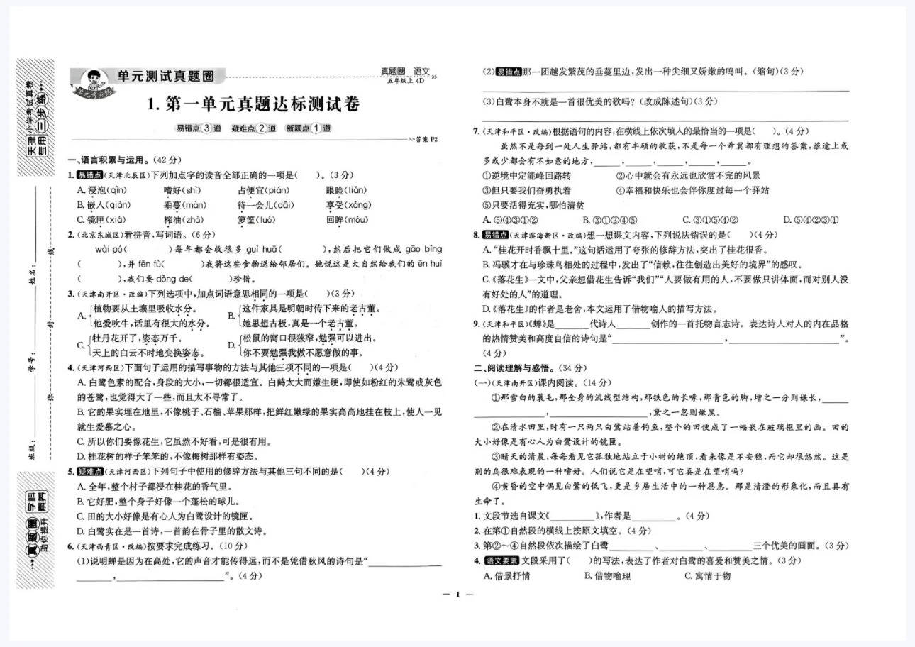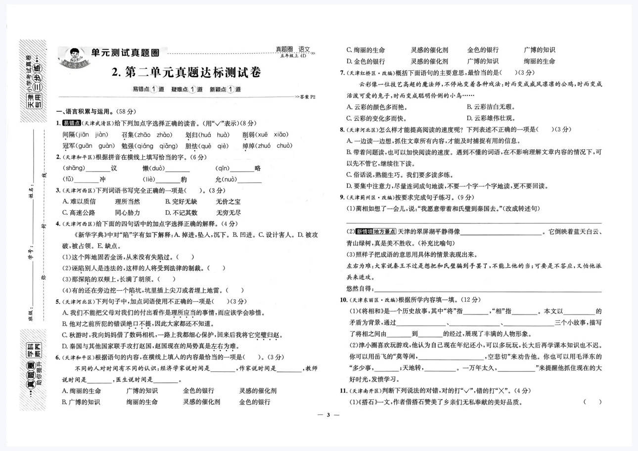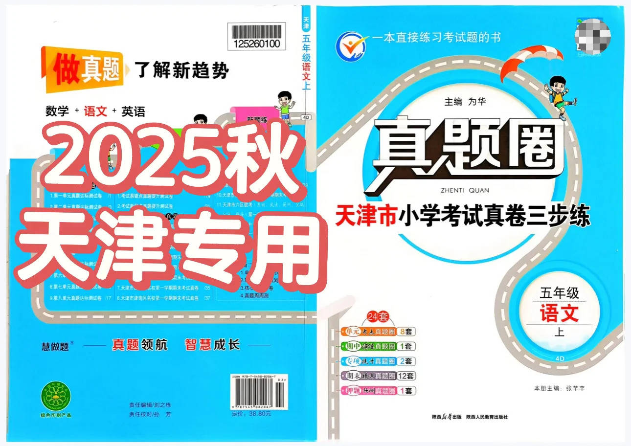 天津五年级语文提分,就刷这套真题卷 家有五年级娃的天津家长,别再瞎买教辅了!这套《2025秋真题圈·天津市小学考试真卷三步练》(语文人教版五年级上册),简直是为本地娃量身定做的复习神器 为啥天津家长都认它? • 精准贴考情:和平、河西等教育强区真题全覆盖,题型、难度完全对接天津本地考试,练完上考场像"刷过原题"。 • 三步练透考点:基础巩固抓字词积累,能力提升攻阅读分析,拓展拔高练写作表达,循序渐进打牢根基。 • 解析超省心:每道题都附详细思路,阅读题教答题角度,作文给改进建议,孩子自学也能查漏补缺。 这样用效果翻倍 1. 日常:每天1套单元卷,及时补漏基础稳; 2. 周末:刷专项卷突破阅读、写作难点; 3. 考前:练模拟卷适应节奏,错题复盘稳提分。 五年级是语文拉分关键期,用对真题卷少走弯路!