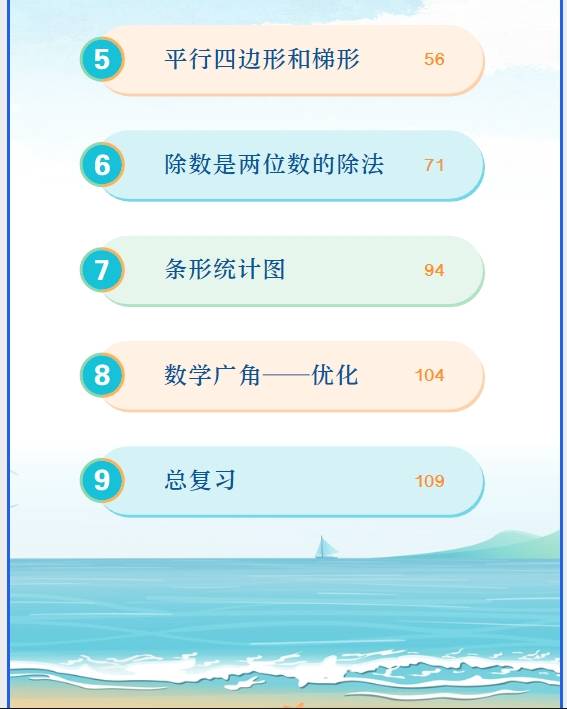 - 数学广角 —— 优化思想:通过 “沏茶问题” 等简单的生活事例,体会如何合理安排时间,才能在最短的时间内完成多项任务;通过 “烙饼问题” 探索如何最优化地利用资源,以最少的时间完成任务,培养优化意识。