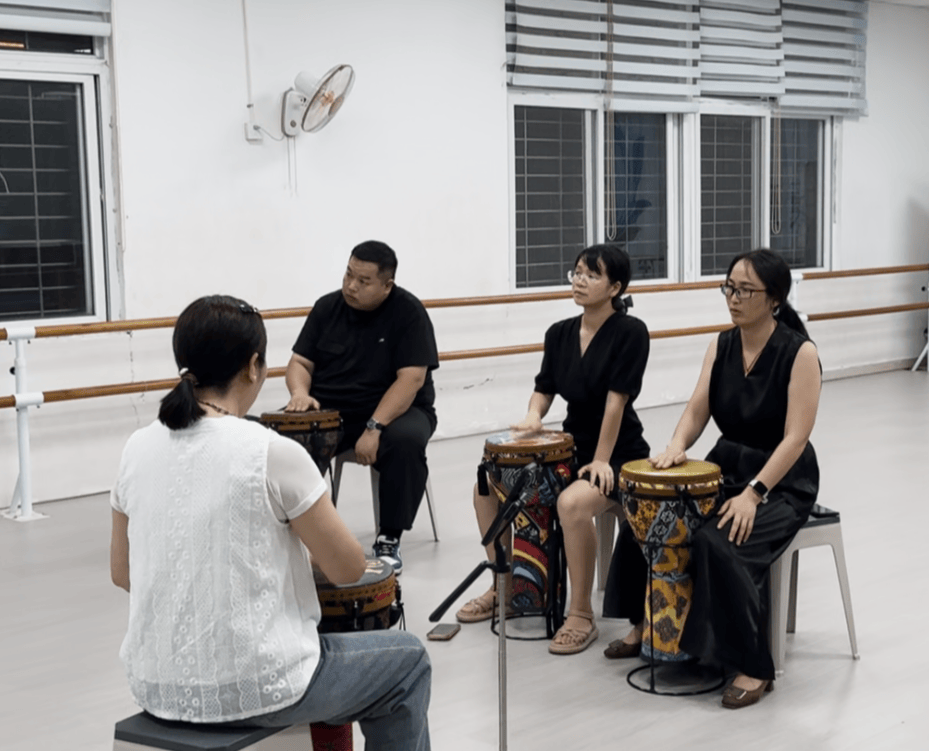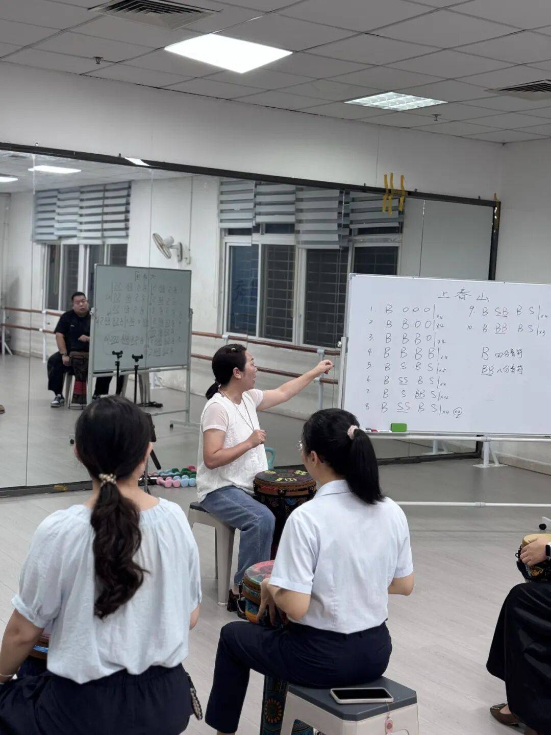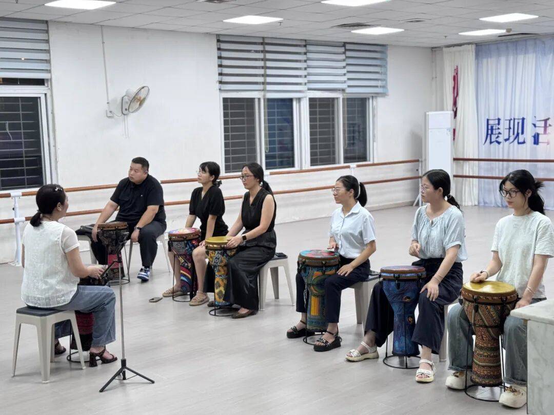 在非洲鼓课堂上,老师一边手持鼓具示范,一边为学员详细讲解乐器基本知识,耐心传授敲鼓技能,每位学员都热情参与学习并积极互动,在欢快音浪中学习非洲鼓技能,感受音乐魅力。