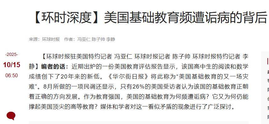 信源来自:环球时报 2025-10-15 【环时深度】美国基础教育频遭诟病的背后