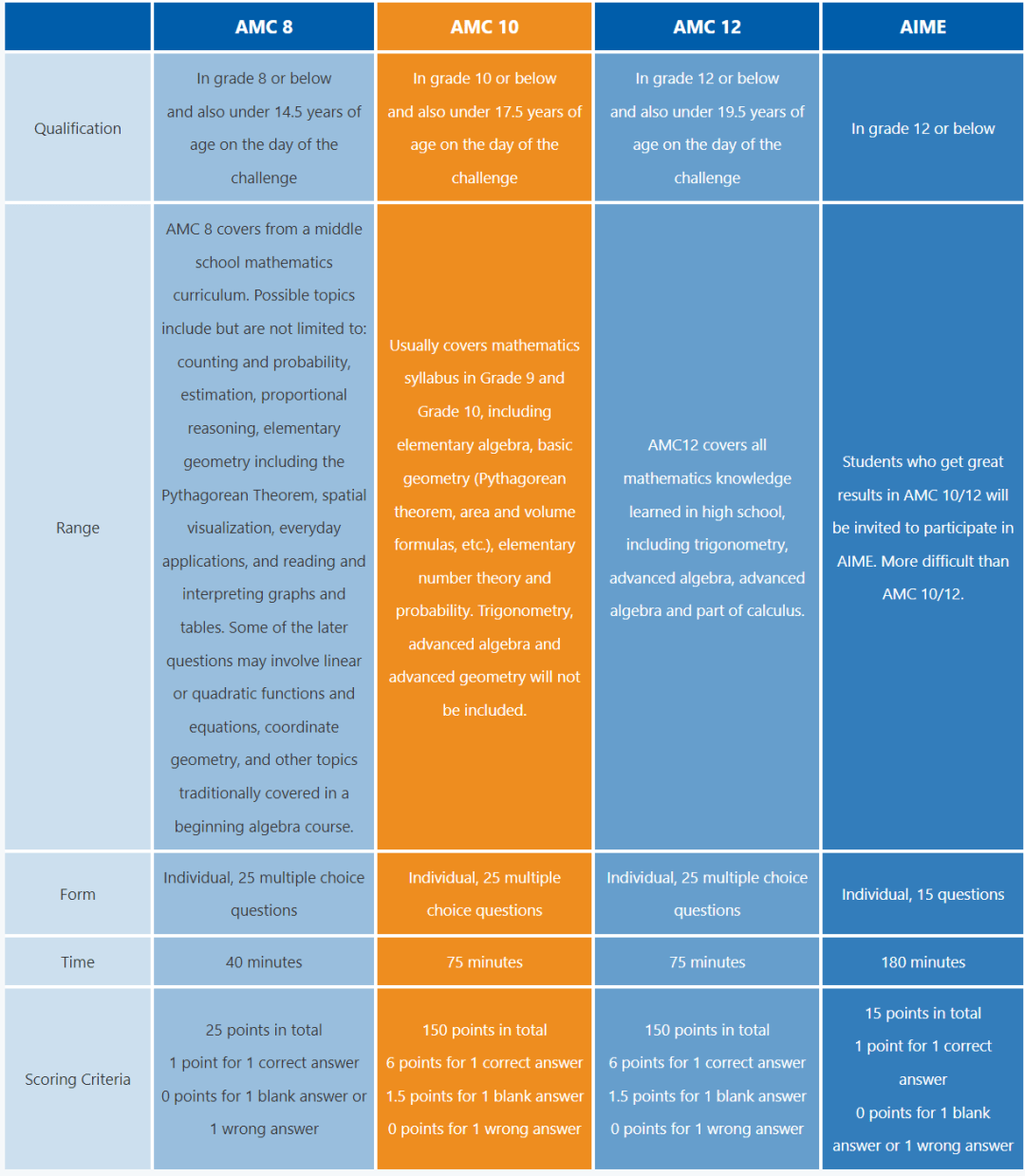 AMC8(针对8年级及以下学生)、AMC10(针对10年级及以下学生)和AMC12(针对12年级及以下学生)等。