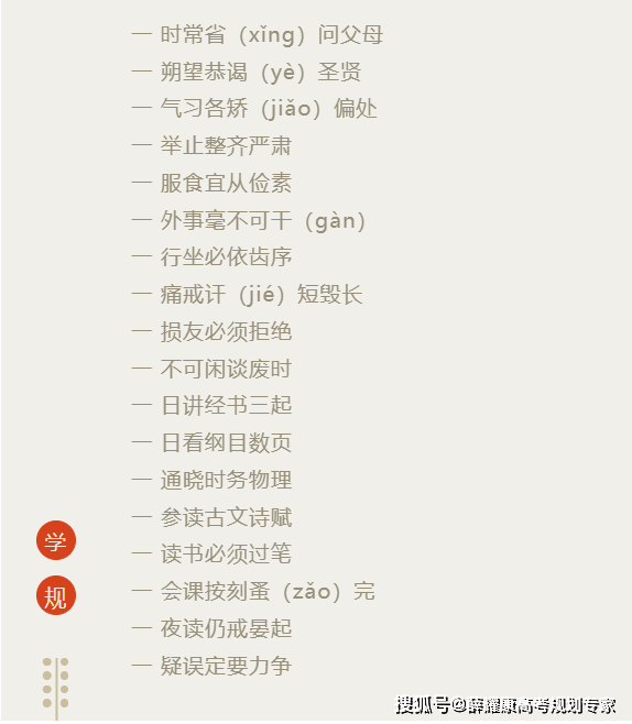 这套公元 1748年制定的岳麓书院的学生守则,已有277岁高龄。总共 108字,18条,每条6个字,简洁全面,通俗易懂。把 德育摆在首位,前 10条均讲 道德规范,诸如经常问候父母,初一十五祭拜圣贤,吃饭穿衣要俭朴,行坐要按长幼等,没有一句大道理。后 8条讲做学问的态度和方法,也是“ 读书必须过笔”“ 夜读仍戒晚起”等大白话。而“ 通晓时务物理”和“疑误定要力争”是岳麓书院培养经世致用之才的法宝。