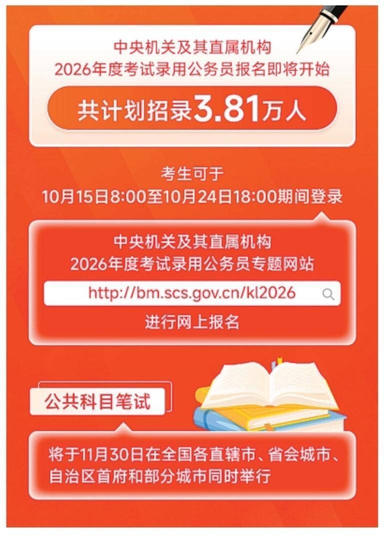 新华社北京10月14日电 记者14日从国家公务员局获悉,中央机关及其直属机构2026年度考试录用公务员报名即将开始,共计划招录3.81万人。考生可于10月15日8:00至10月24日18:00期间登录“中央机关及其直属机构2026年度考试录用公务员专题网站”(http://bm.scs.gov.cn/kl2026)进行网上报名,公共科目笔试将于11月30日在全国各直辖市、省会城市、自治区首府和部分城市同时举行。