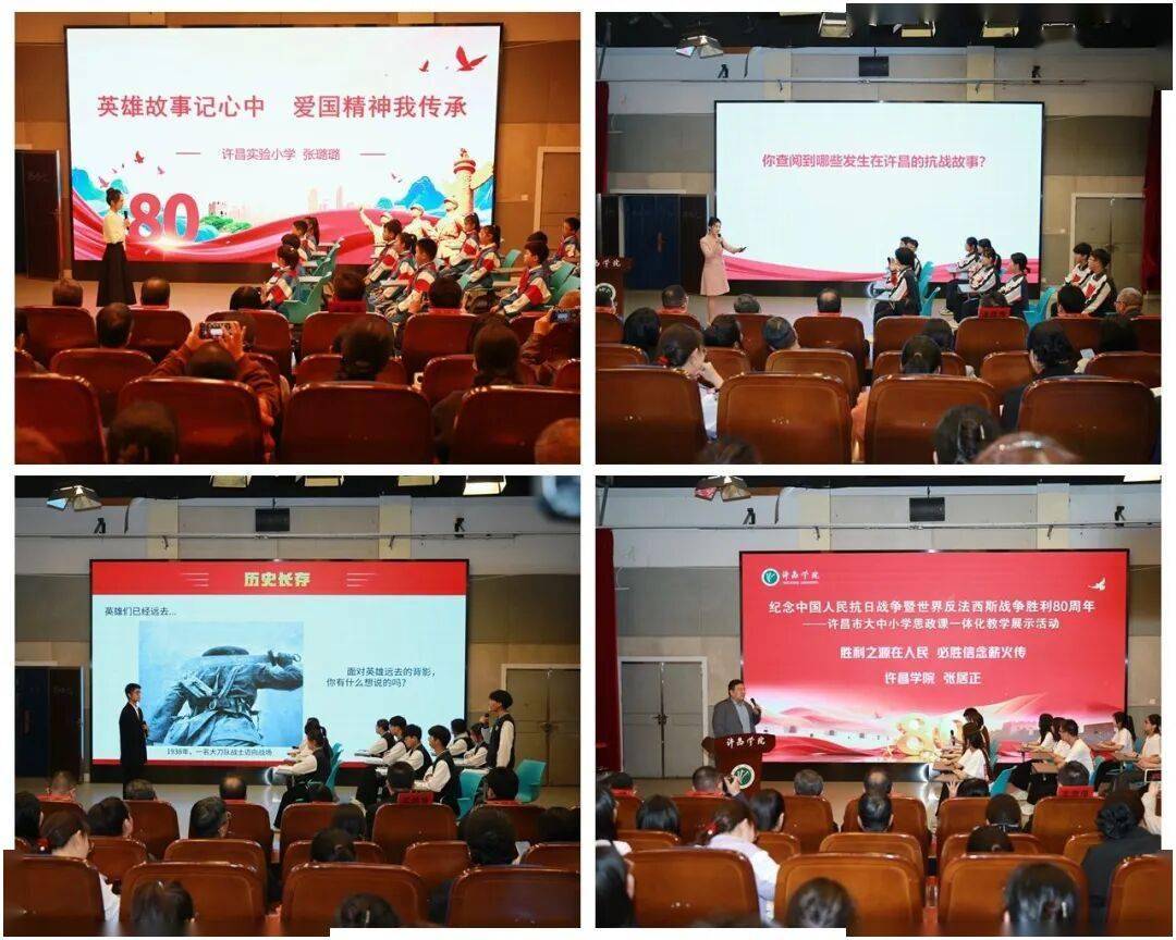 在教学展示环节,许昌实验小学张璐璐、许昌市东城区实验中学朱梦博、许昌工商管理学校李古月、许昌学院思政课教师张居正四位老师围绕本次活动主题,分别以《英雄故事记心中爱国精神我传承》《许昌烽火淬气节抗战精神照山河》《英雄踏破千重险掷躯犹筑万仞城》《胜利之源在人民必胜信念薪火传》为题,进行了不同学段的教学成果汇报。