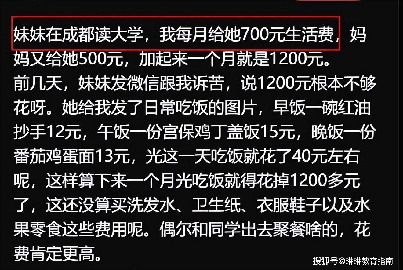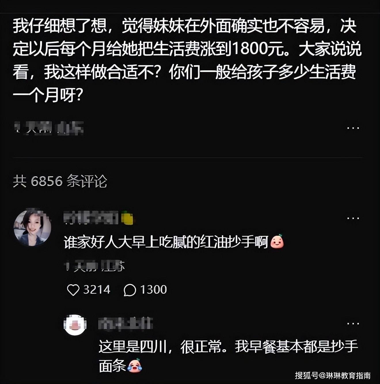 最终在寻求网友的建议后,姐姐也认为妹妹一个人在成都上大学的确不容易,决定给妹妹的生活费从1200元上涨到1800元,虽然不能让妹妹像那些富养的女大学生一样喜欢什么就买什么,但至少不用因为一碗12元的红油抄手再跟家里吵架了。