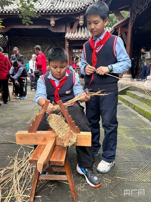 学校通过红色研学、“小红军”体验节等活动深化红色教育,组织学生重走长征路、模拟长征场景。在红色教育实践中,学校还将编草鞋作为传承革命精神的重要载体。老师们手把手指导学生学习编草鞋技艺,从搓草绳到编织成型,学生们亲手制作的每一双草鞋,都让他们直观体会到革命年代物资匮乏的艰辛,以及先辈们艰苦奋斗、攻坚克难的意志,让红色基因在动手实践中代代相传。