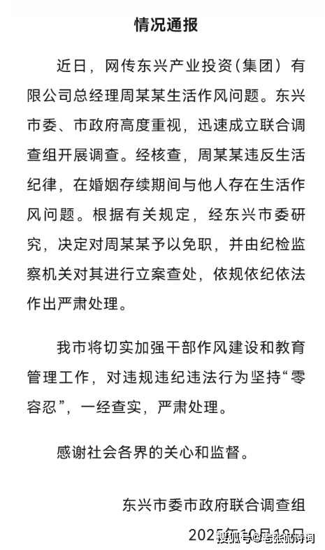 广西东兴市委市政府联合调查组发布通告,广西东兴产业投资集团有限公司总经理周某某,因婚内出轨被免职并立案查处。