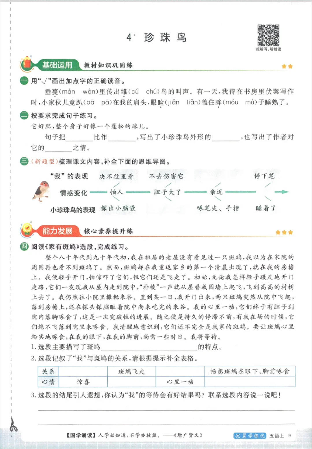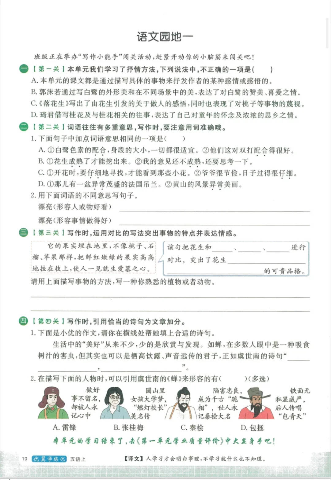 五年级是语文学习从 “基础积累” 向 “文学鉴赏与人文感悟” 进阶的关键期,这份资料把重难点拆解得明明白白。“基础运用” 板块抓牢字词(如《白鹭》中 “黄昏”“悠然” 等词的书写与辨析),夯实语文根基;“能力发展” 板块通过思维导图、真题链接,深度解析课文(如《落花生》的借物喻人写法、《白鹭》的场景美),锻炼阅读思维;“拓展延伸” 板块结合跨学科(如白鹭官服文化)、生活实践(月下情景描写),让知识落地实用。对五年级娃的学习帮助可太大了!分层训练超科学,基础题巩固课内知识(生字词、课文背诵),提升题挑战思维(阅读策略运用、写作技巧),综合题融合新情境(跨学科、生活实践);题型新颖又贴合考情,“白鹭官服补子分析”“无花果借物喻人” 这类题目,把语文和历史、生活结合,学起来不枯燥;还有素养导向设计,从字词到阅读、写作,逐步培养娃的语文核心素养。五年级用这份资料,既能扎实掌握每单元知识点,又能提升阅读鉴赏、写作表达、人文感悟等综合能力,成绩想不稳步提升都难~