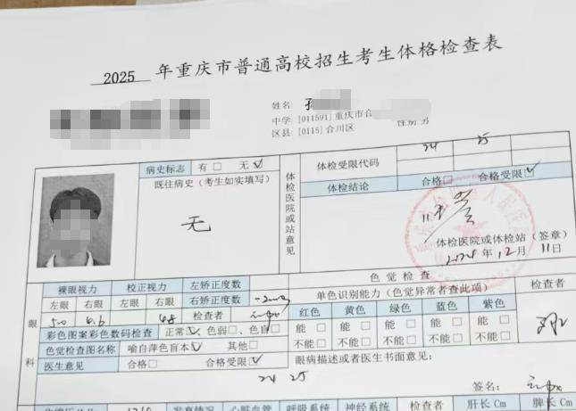 近日,重庆市民黄先生反映,其儿子孙某某是2025年应届高考体育特长生,高考后被遵义医科大学运动康复专业录取。没想到入学不久学校体检复查时,儿子被查出色弱遭到退学,而高考时的体检显示是正常的。