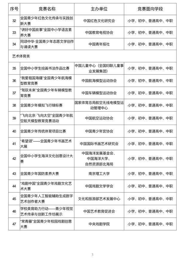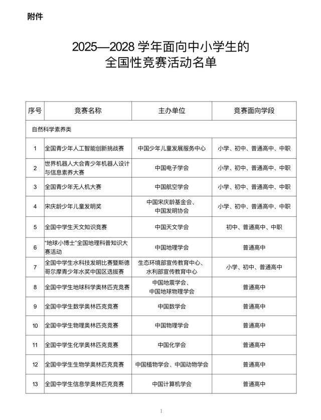 日前,教育部公布了2025—2028学年面向中小学生的全国性竞赛活动名单,共有“全国青少年人工智能创新挑战赛”等47项竞赛进入名单。