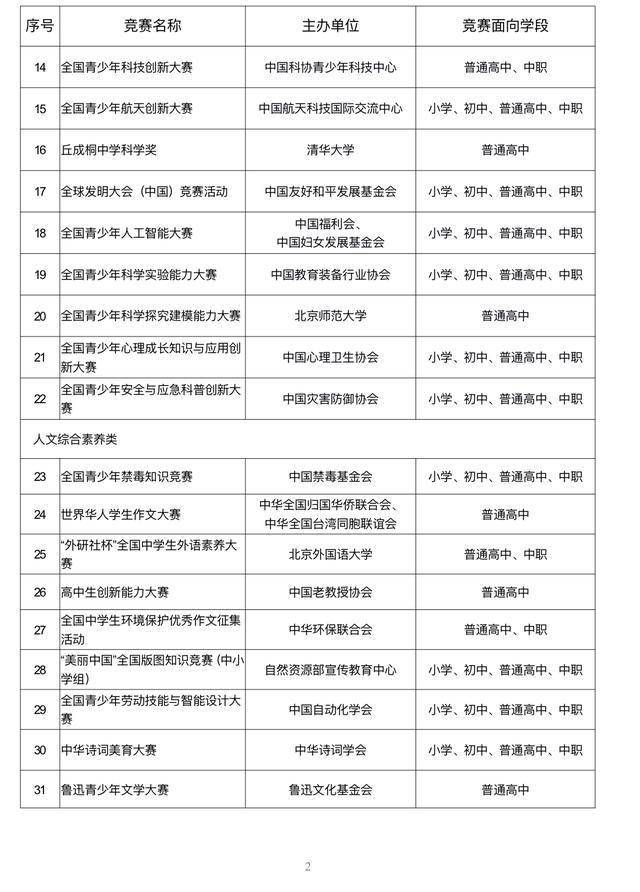 此次公布的名单是按照教育部、中央编办、民政部和市场监管总局等四部门2022年印发的《关于面向中小学生的全国性竞赛活动管理办法》(以下简称《管理办法》)要求,由主办单位自主申报,经教育部组织专家进行评审、公示和复核等程序后最终确定。入围竞赛的举办时间原则上为2025年10月至2028年8月,在此期间每学年举办不得超过1次,累计不超过3次。竞赛以及竞赛产生的结果不得作为中小学招生入学的依据和高考加分项目,不得在高校招生中违规使用竞赛结果。