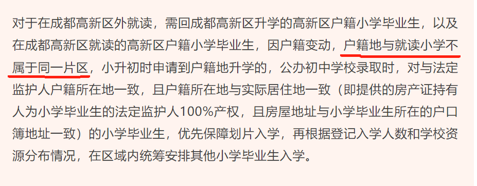 在小升初方面,高新区今年也做了要求,明年大概率会延续这个政策。小升初阶段,学籍和户籍不在同一个片区,如果选择在户籍地升学,也是要求满足“两个一致”条件,否则有被统筹的风险。