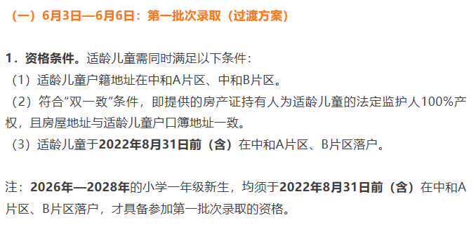 中和A片、B片的多校划片政策从2022年开始实行,属于过渡方案。官方此前回复,到2028年过渡期结束后,A片、B片将统一为一个批次录取。