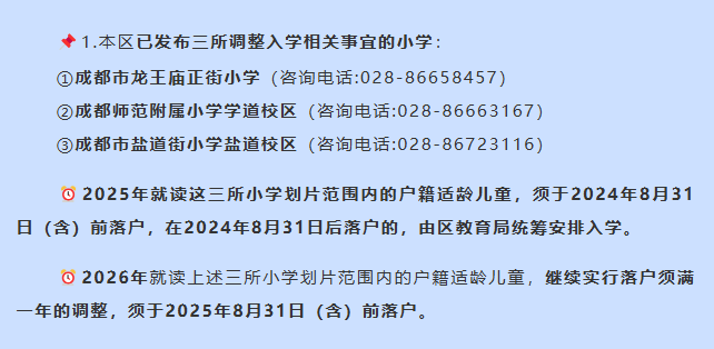 今年上半年,官方在公布锦江区小学入学政策时就提到,明年入读以下3所学校的适龄儿童需要在2025年8月31日(含)前落户: