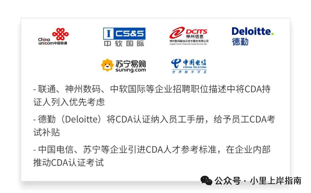 📊 从表中可见,CDA证书在薪资和就业机会上优势明显。中国联通、央视广信、德勤、苏宁等企业,都把CDA持证人列入优先考虑范围,甚至为员工的CDA考试提供补贴。
