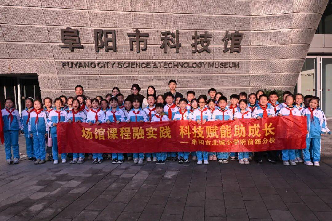 最后,师生们在科技馆门口合影,阳光洒在孩子们的笑脸上,与身后的“阜阳市科学技术馆”字样一起,定格成这个十月最难忘的画面。