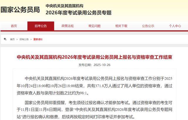 据央视新闻消息,中央机关及其直属机构2026年度考试录用公务员网上报名与资格审查工作分别于2025年10月24日18:00和10月26日18:00结束,共有371.8万人通过了用人单位的资格审查,通过资格审查人数与录用计划数之比约为98∶1。