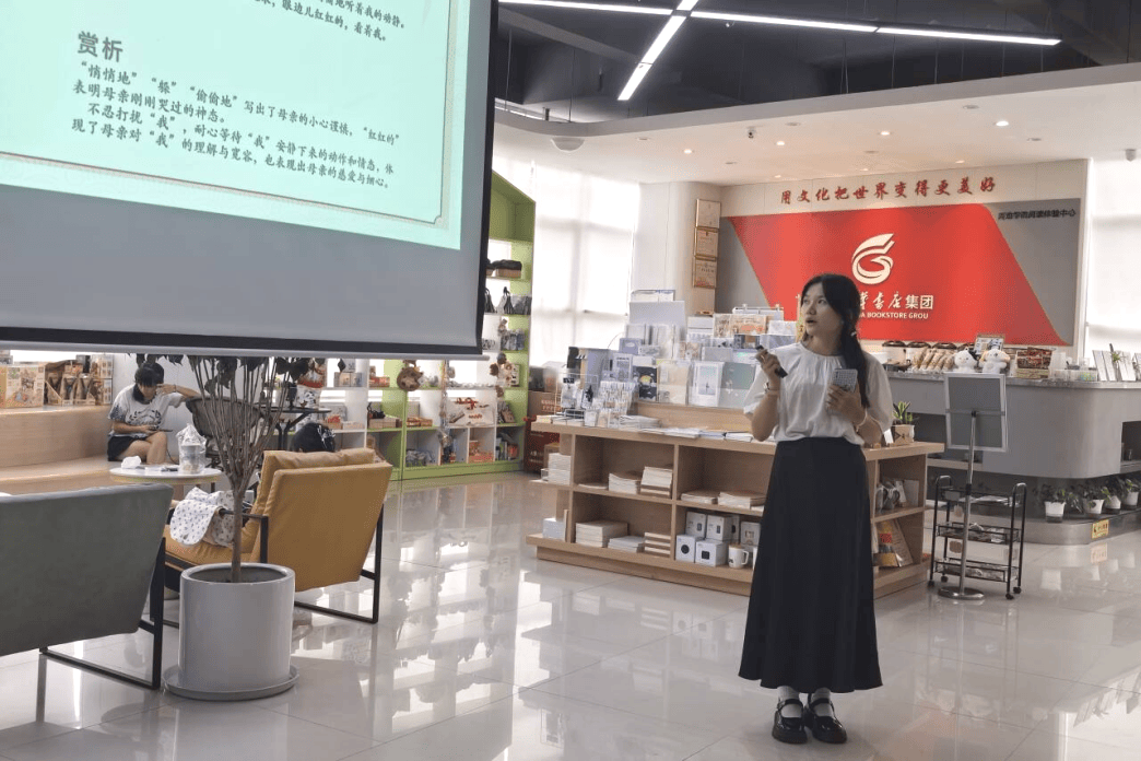 韦乐然以诙谐幽默的开场与独特的互动暖场方式,迅速点燃现场氛围。她围绕郁达夫经典作品《故都的秋》,从题目内涵、佳句赏析、情感主旨、意象解读四个维度展开分享。在她的阐释下,全体成员深刻领会到作者对故都之秋的深情颂赞与对故乡的眷恋,不仅打破了中国传统文人"悲秋"的传统审美基调,更让在场者刷新了对"秋"的刻板认知。