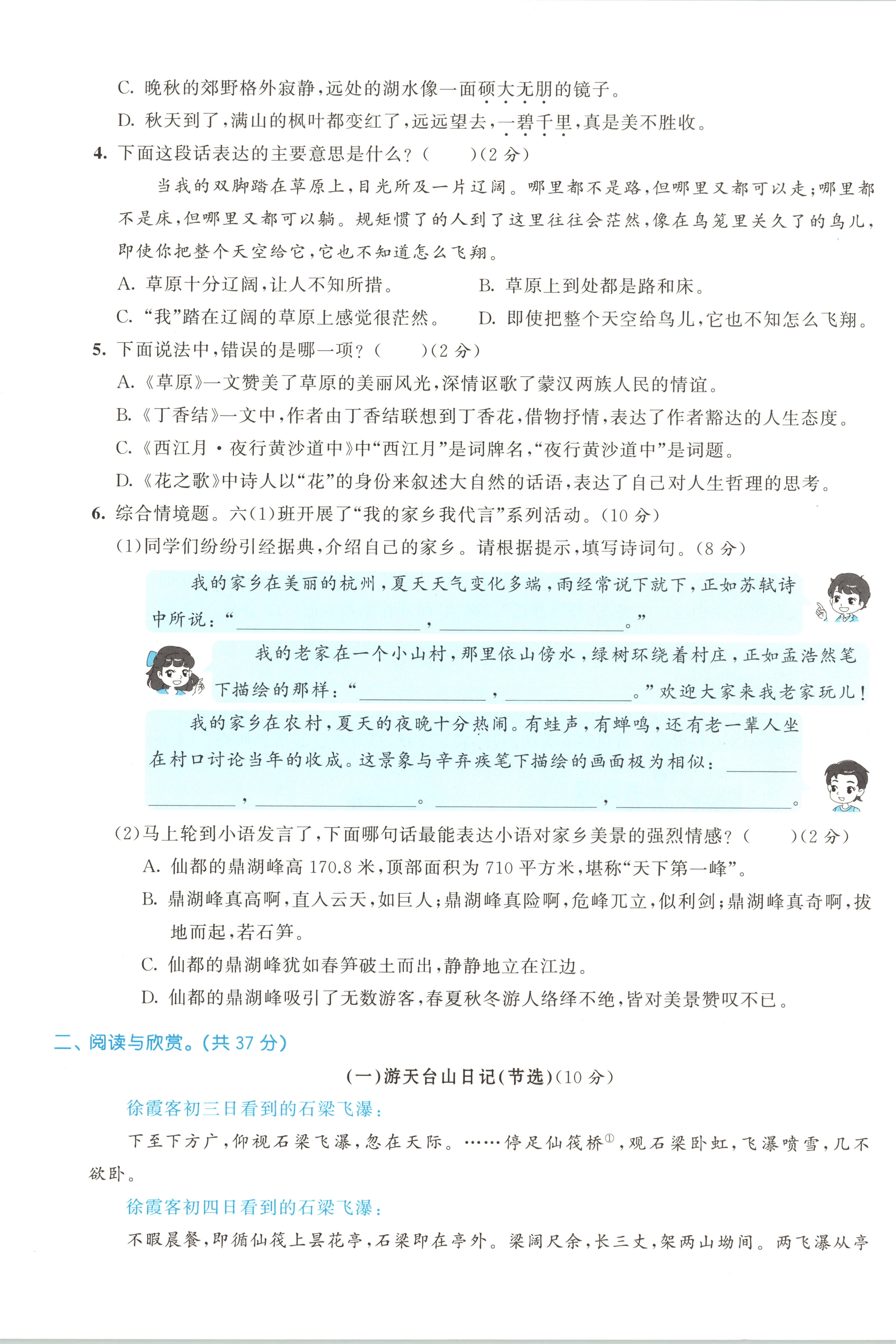 今天为大家分享:25秋六上语文1~8单元新题型测试卷+期中期末专项新题型测试卷(53新题型)含答案,积累与运用板块,涉及根据拼音写词语、字音字形辨析、词语运用、诗句填空、课文内容回顾及综合情境题等,夯实字词、诗句、课文知识的积累与运用能力;阅读与欣赏板块,包含文言文《游天台山日记(节选)》、非连续性文本 “盘花扣展览”、现代文《生命的选择》三类阅读材料,考查学生文言文字义理解、朗读节奏划分、信息提取、文本分析及感悟能力;表达与交流板块,要求学生展开想象,以 “变成超市购物袋” 为情境写故事,提升创意表达与写作能力。