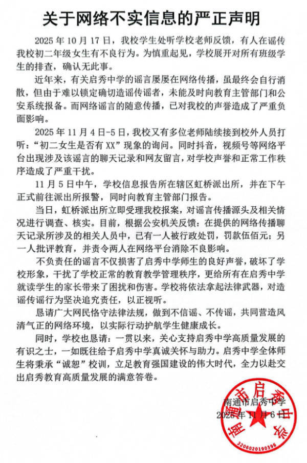 11月6日下午,南通市启秀中学发布关于网络不实信息的严正声明,全文如下: