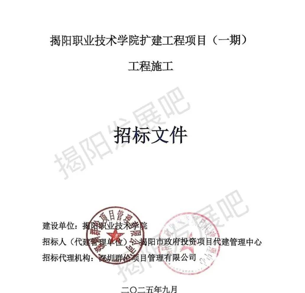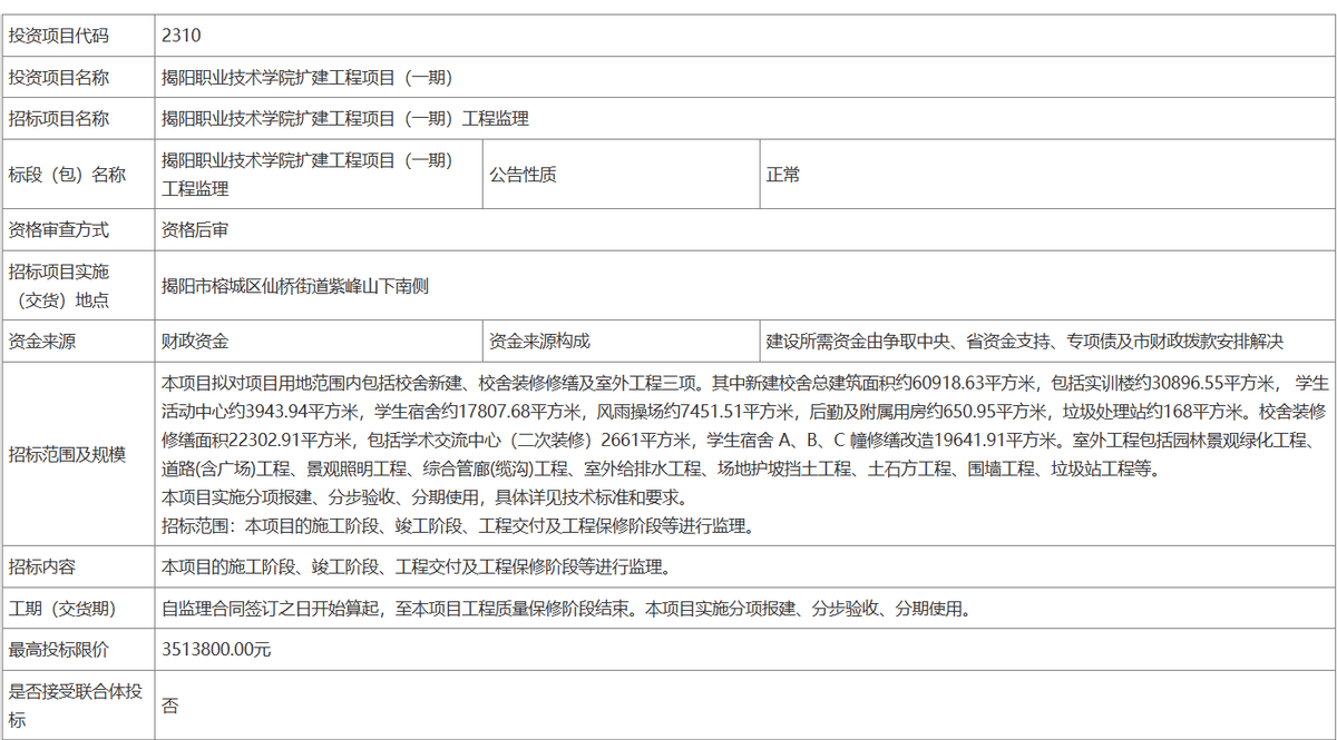 根据揭阳职业技术学院(公办专科)扩建工程项目(一期)工程施工招标公告内容: