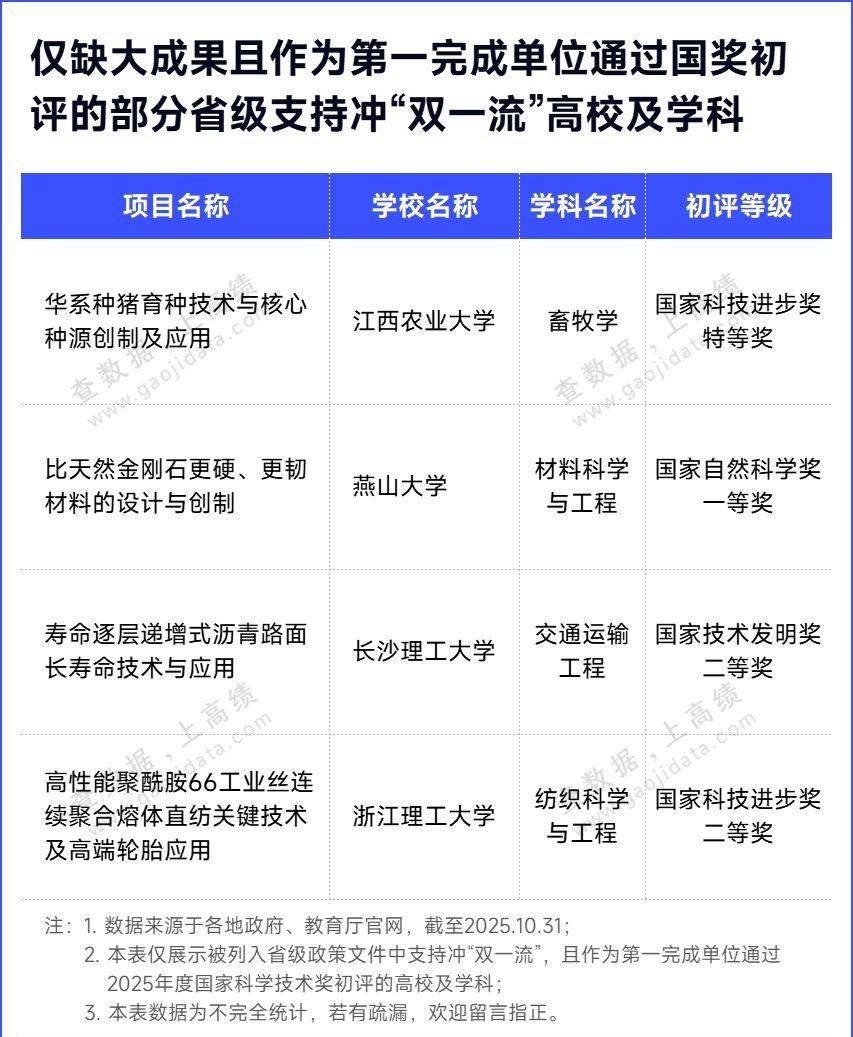 获得省级政府支持冲刺“双一流”建设的部分高校学科,据高绩(ID:gaojidata)统计,多个学科在“双一流”核心指标上仅缺大成果指标尚未达标,其余指标均已达标。其中四所高校,已作为第一完成单位通过2025年度国家科学技术奖初评,若成功斩获国奖,有望顺利晋级第三轮“双一流”名单!