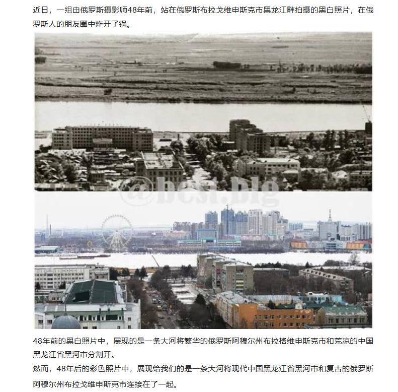 这种吸引力,还体现在一种肉眼可见的时代变迁中。有俄罗斯摄影师曾翻出48年前在布拉戈维申斯克江畔拍摄的老照片,那时的黑河,在他的镜头里还是一片荒凉的村落,与对岸繁华的苏联远东城市布拉戈维申斯形成鲜明对比。