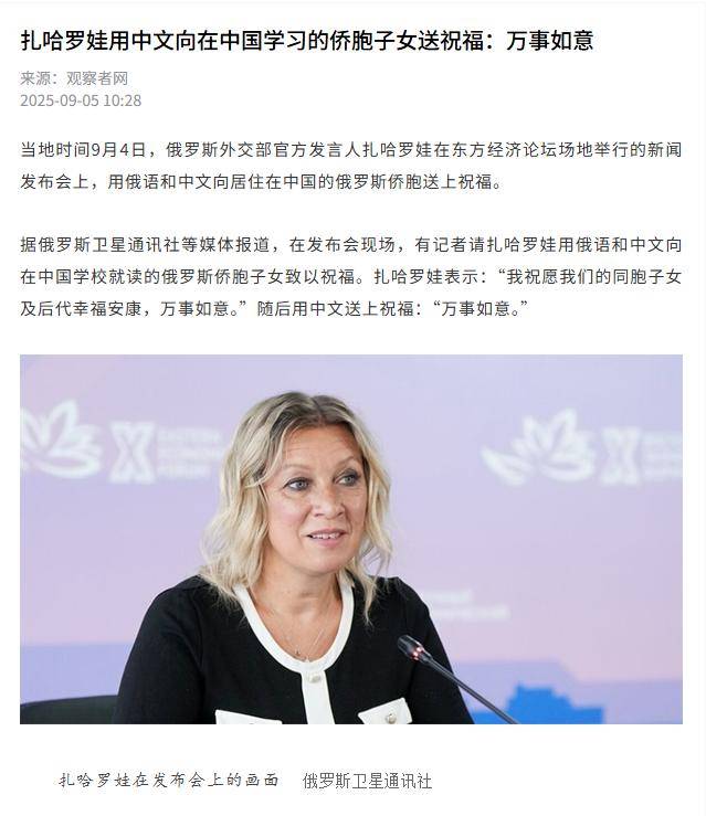 这话可不是我脑补出来的啊。当地时间9月4日,在海参崴举行的东方经济论坛新闻发布会上,被许多中国网友亲切地称为“扎姐”的俄外交部发言人扎哈罗娃,就用中俄双语向住在中国的俄罗斯侨胞送上祝福。
