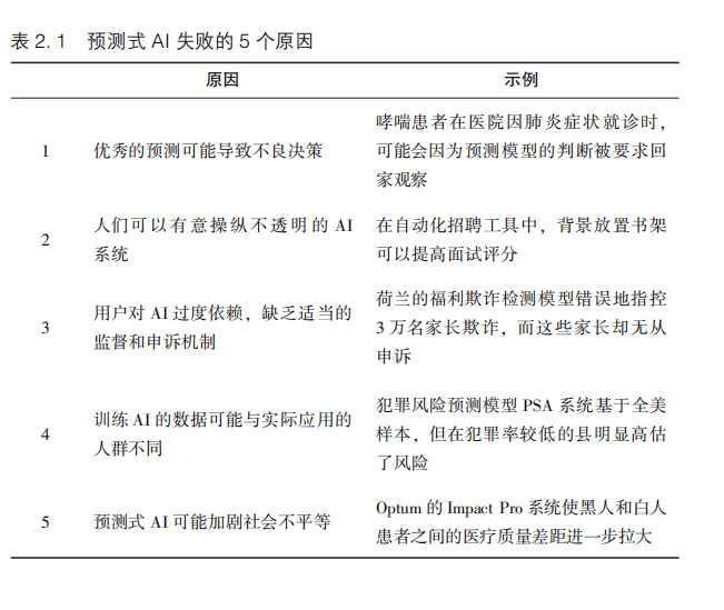 在本章中,我们将探讨预测式 AI出错的原因。全面记录所有失败案例可能会超出整本书的篇幅,所以我们将重点介绍一些常见且难以纠正的失败案例。这些案例能够凸显预测式AI有效运作时面临的复杂性和挑战。