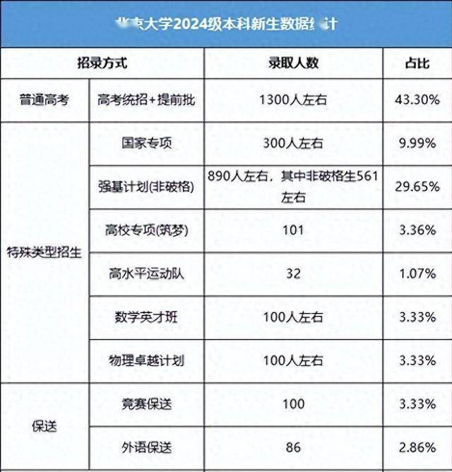 就拿北大录取来说吧,2024年通过高考录取的仅占43.3%,通过强基计划、高校专项计划、国家专项计划、竞赛保送生、外语类保送生、高水平运动队、物理卓越计划、数学英才班等八种方式录取的高达56.7%。