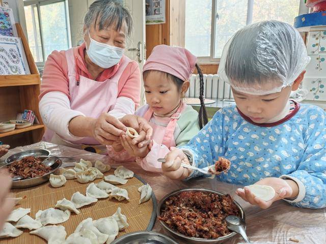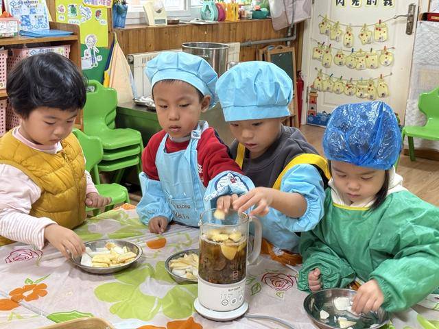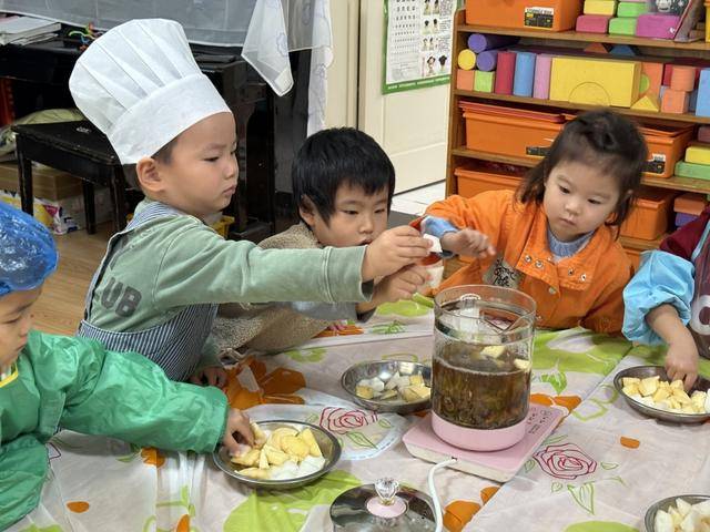 根据幼儿年龄特点,幼儿园精心设计活动:大班级部的亲子包羊肉水饺,场面温馨又热闹,孩子们在家长的协助下,在老师的指导下放馅、捏合,忙得不亦乐乎;中班级部则飘荡着桂花糯米藕的甜香,孩子们相互合作将糯米塞入莲藕,体验着“秋收冬藏”的智慧;小班级部的“围炉煮茶”则别有一番风味,孩子们与老师围坐在一起切水果、配水果,看着水果在锅中咕嘟咕嘟地翻滚,感受着冬日里独特的温暖与快乐。