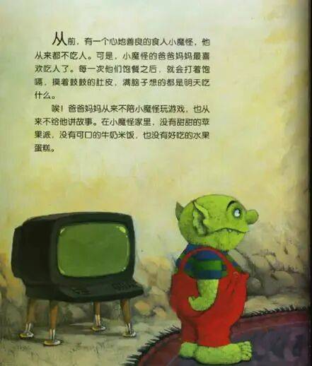 从前,有一个心地善良的食人小魔怪,他从来都不吃人。可是,小魔怪的爸爸妈妈最喜欢吃人了。每一次他们饱餐之后,就会打着饱嗝,摸着鼓鼓的肚皮,满脑子想的都是明天吃什么。