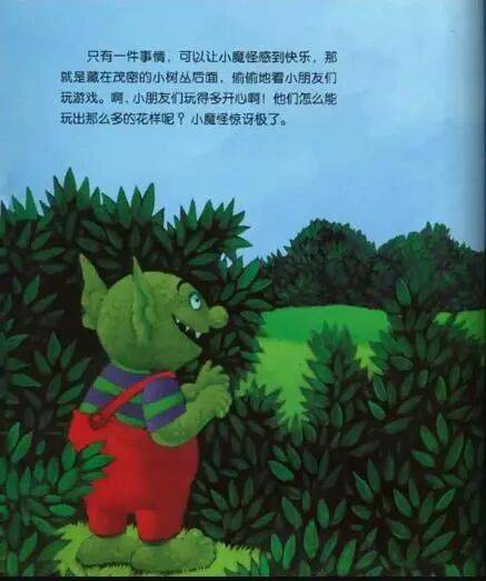 只有一件事情,可以让小魔怪感到快乐,那就是藏在茂密的小树丛后面,偷偷地看小朋友们玩游戏。啊,小朋友们玩得多开心啊!他们怎么能玩出那么多的花样呢?小魔怪惊讶极了。