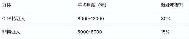 提升与考证的逻辑关系:提升技能是“内功修炼”,而考证是“外功认证”。在当今大数据和人工智能时代,数据分析能力已成为职场万金油技能,就像开车需要驾照一样,考证能证明你的专业水平,帮助你在求职中脱颖而出。数据显示,CDA持证人平均薪资比非持证人高出20%以上,如下表所示(数据来源:行业报告统计):