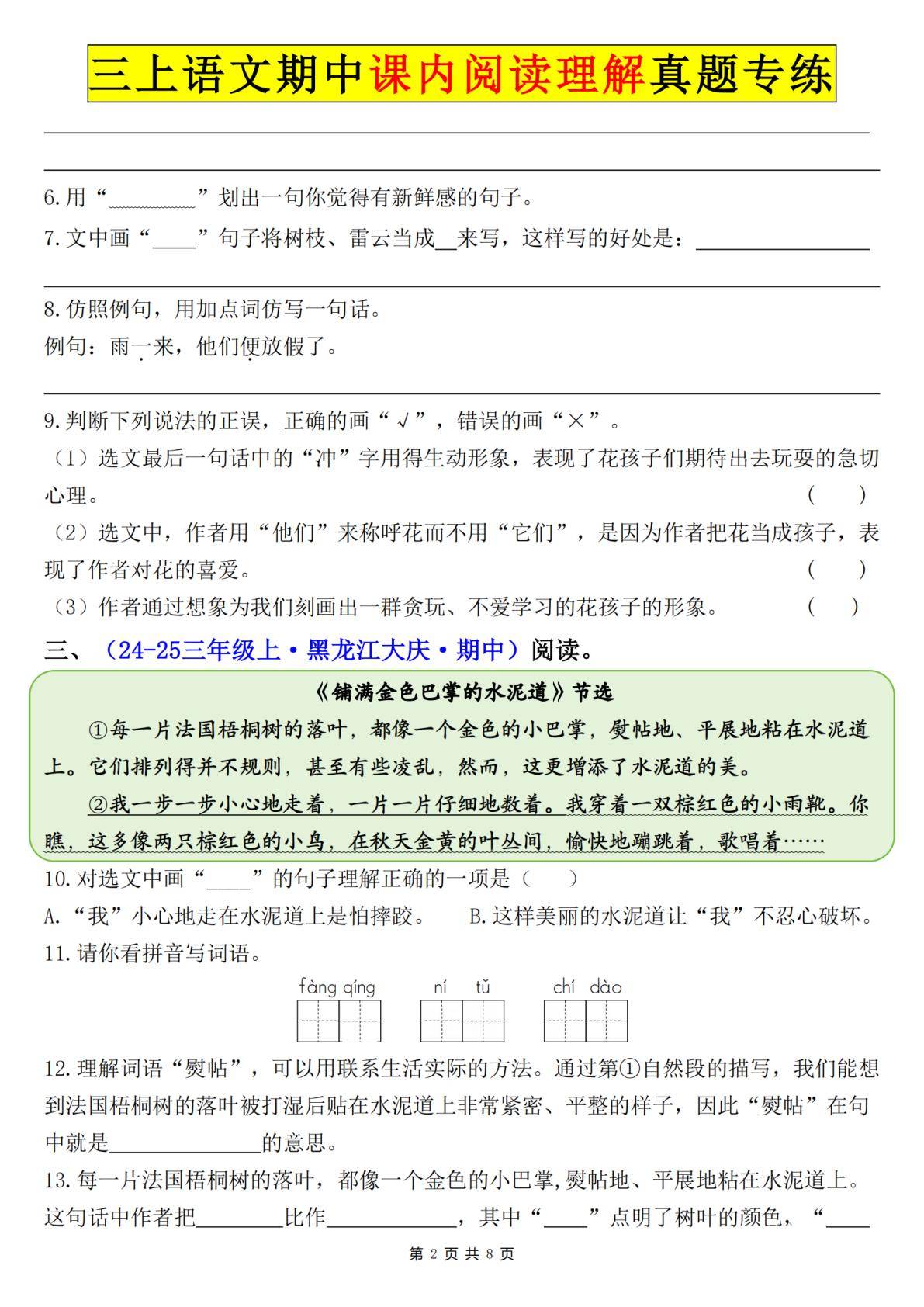 25年三年级上册语文期中课内阅读理解真题专练(空白+答案16页)