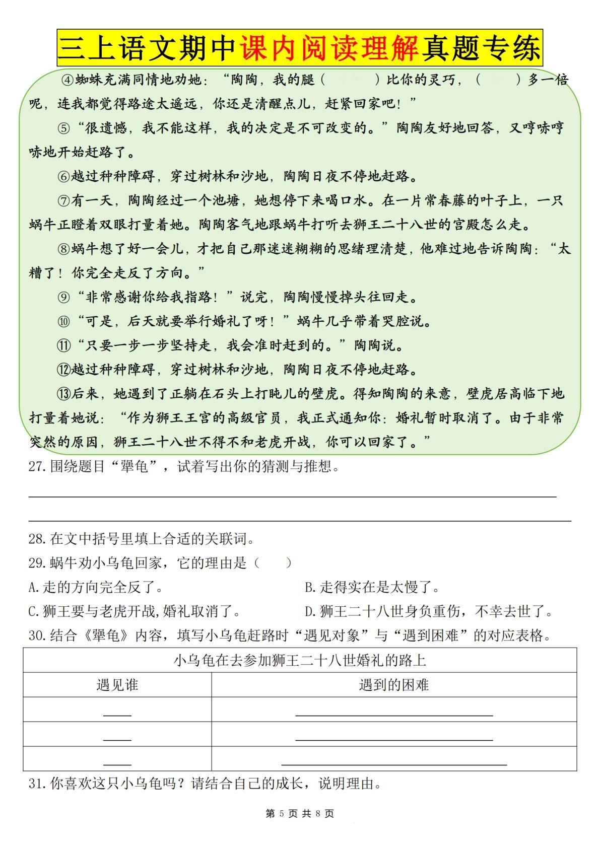 今天为大家分享:112【25年三上语文期中课内阅读理解真题专练(空白+答1案16页),是针对三年级上册学生语文课内阅读能力提升的专项训练素材。它涵盖了阅读知识考查、语文能力培养、学科素养提升等多个方面,对学生的语文学习有着多维度的助力。