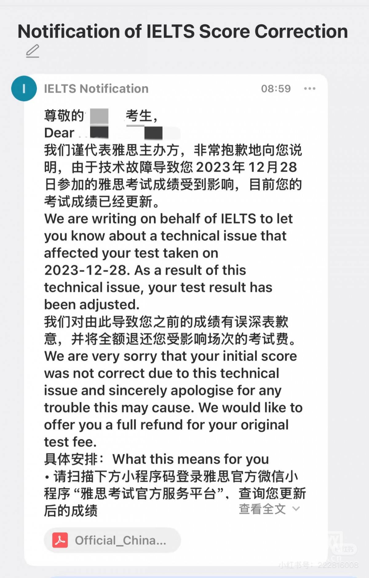 根据雅思主办方发布的说明,受故障影响的考试场次时间跨度超过2年:最早是2023年8月的某些场次,一直持续到2025年9月。官方邮件统一口径为“技术故障导致成绩受影响”,同时告知考生成绩已更新,并承诺“全额退还受影响场次的考试费”。